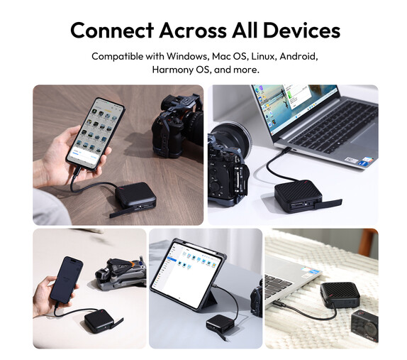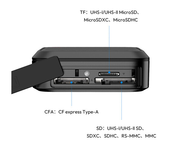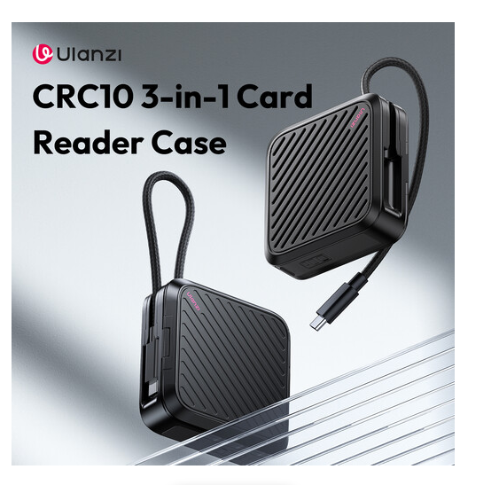 Futrola za čitač kartica Ulanzi C078GBB1 CRC10 3-u-1 spaja brzi prijenos podataka i sigurno pohranjivanje medija u jednom kompaktnom dizajnu. Podržava CFexpress Type A, SD i microSD kartice, ima integrirani USB-C 3.2 Gen 2 kabel brzine 10 Gb/s, više utora za pohranu te izdržljivo kućište od legure aluminija za učinkovito raspršivanje topline i pouzdane performanse u pokretu.