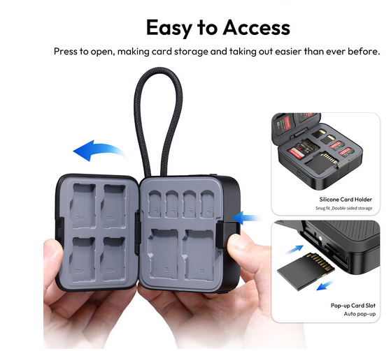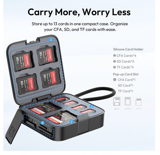 Ulanzi CRC10 3-u-1 kućište za čitač kartica je moćno i prenosivo rješenje za kreatore kojima su potrebni brzi prijenosi i organizirano pohranjivanje medija. Dizajnirano da funkcionira i kao čitač kartica i kao kućište za pohranu, istovremeno podržava kartice CFexpress Type A, SD i microSD putem tri namjenska utora za čitač. Osim toga, nudi obilje ugrađene pohrane s četiri utora za CFexpress Type A kartice, dva utora za SD kartice i četiri utora za microSD kartice, omogućujući vam pohranu do 13 kartica u jednoj kompaktnoj jedinici. Integrirani USB-C 3.2 Gen 2 kabel omogućuje brzinu prijenosa podataka do 10 Gb/s, što omogućuje brzo sigurnosno kopiranje i učinkovit tijek rada bez potrebe za adapterima. Vanjski dio od legure aluminija poboljšava izdržljivost i odvođenje topline, dok unutrašnjost obložena silikonom štiti kartice od udaraca. S pristupom na gumb, LED indikatorom statusa, velikom kompatibilnošću s operativnim sustavima i ugrađenom trakom za nošenje, CRC10 je idealan suputnik za fotografe, videografe i mobilne profesionalce.