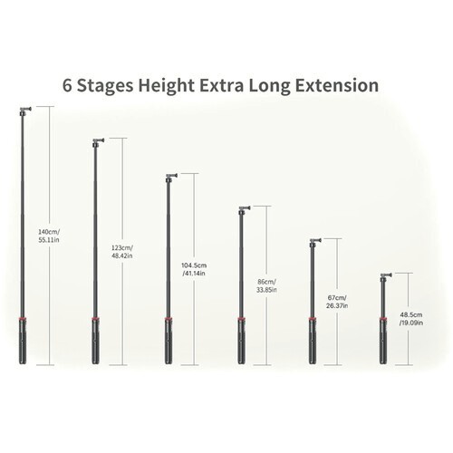 Sa šest razina izduženja, stativ Go-Quick II može se izdužiti od 19,1" (48,5 cm) do 55,1" (140 cm), što omogućuje snimanje iz visokih kutova ili snimanje sebe na daljinu. Kad je sklopljen, dugačak je samo 11,5" (29,3 cm), što ga čini kompaktnim i pogodnim za putovanja. Izrađen od ABS-a i aluminija, lagan je, ali izdržljiv, a teži samo 11,7 oz (332 g). Idealan za vloganje, akcijske sportove, prijenos uživo i snimanje na otvorenom, ovaj stativ pruža stabilnost, prenosivost i svestranost za svaki scenarij snimanja.