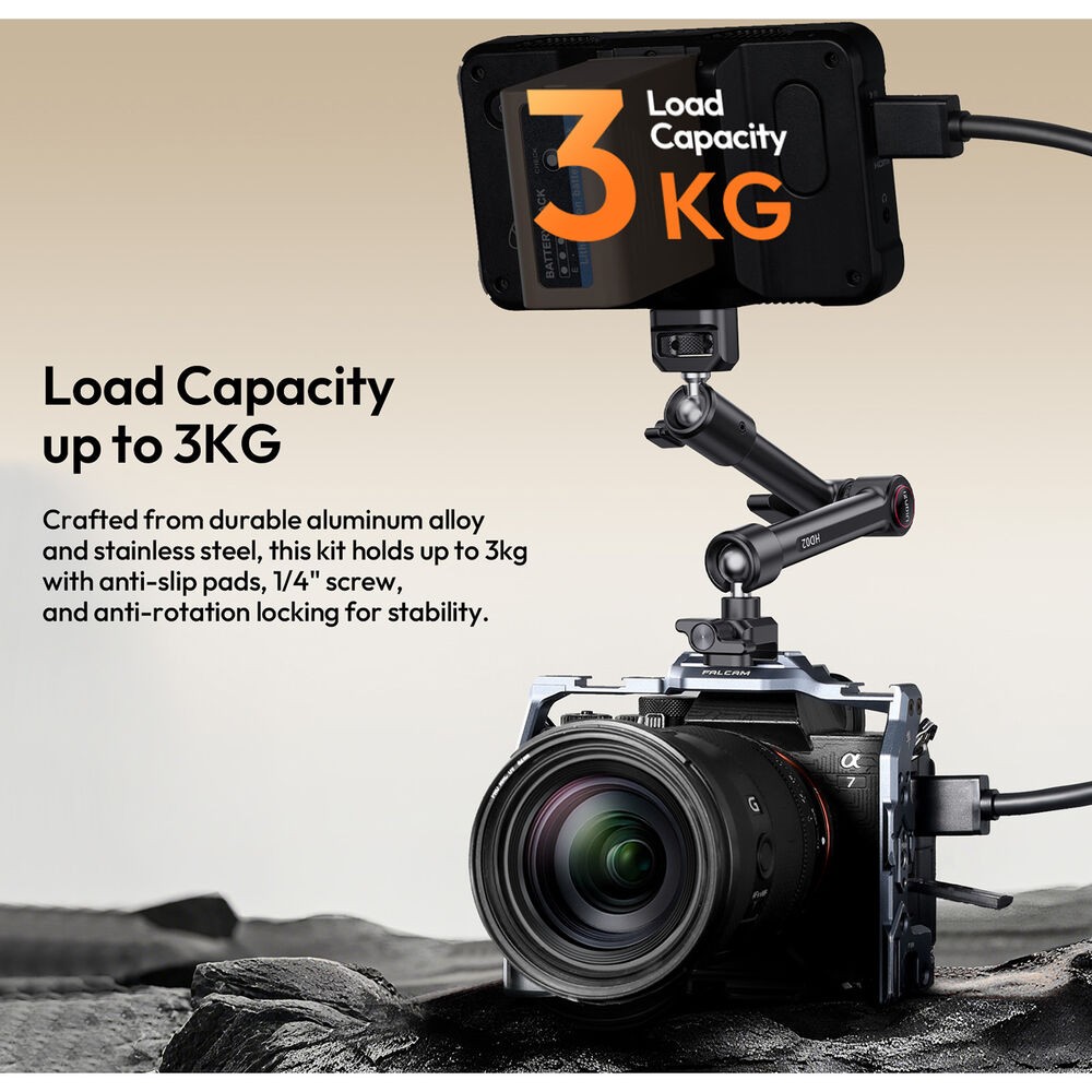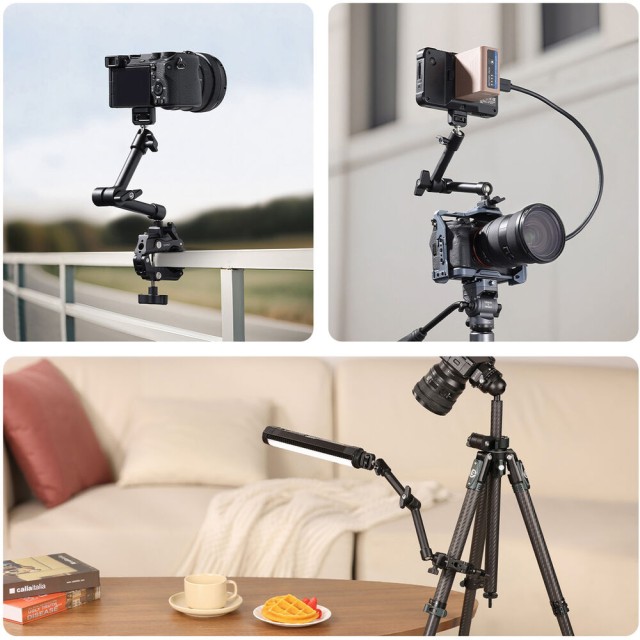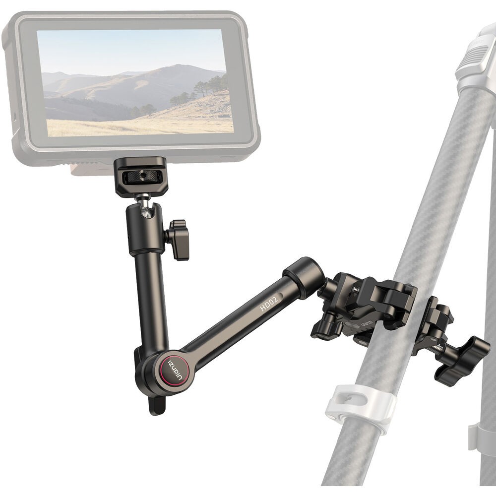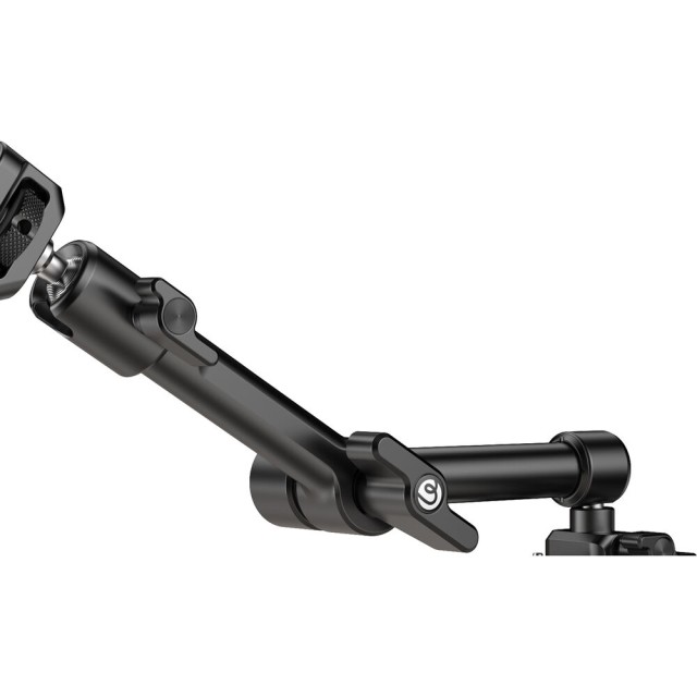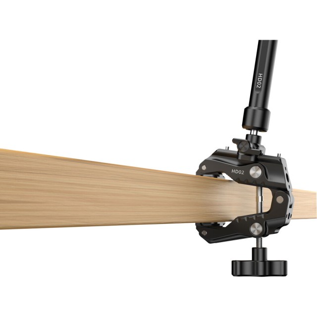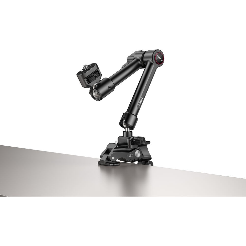 HD02 Magic Arm s Crab ClampodUlanzi je 10" magické rameno s nosností 6,6 lb. Namontujte kamery, světla nebo jiné příslušenství pomocí šroubu 1/4"-20 s polohovacími kolíky ARRI nebo otvorů se závitem 1/4"-20 a 3/8"-16. Rameno připevněte k povrchům o tloušťce 0,86 až 3,4" pomocí přiložené svorky s protiskluzovými podložkami. Po připevnění lze snadno nastavit úhel díky 360° kulové hlavě na každém konci a 360° otáčení mezi dvěma částmi ramene.