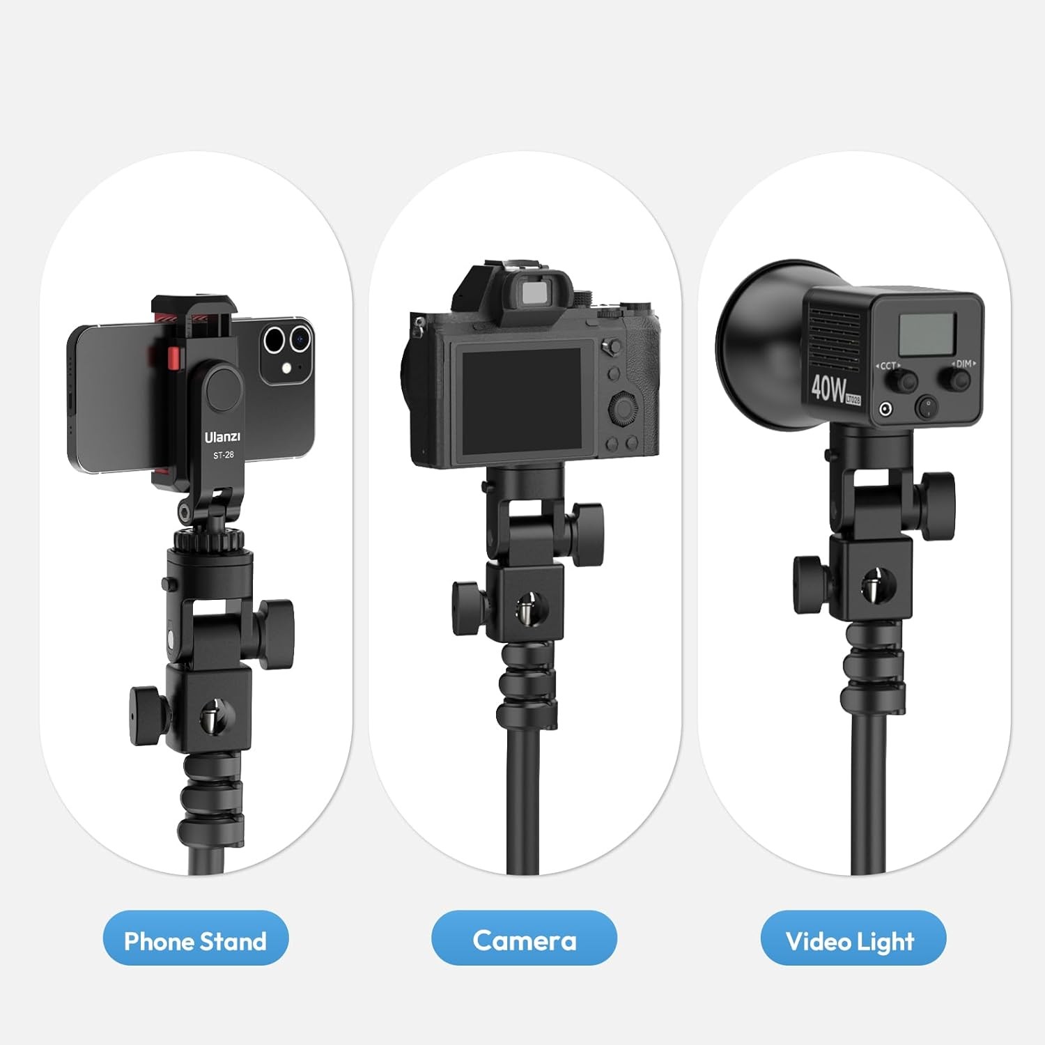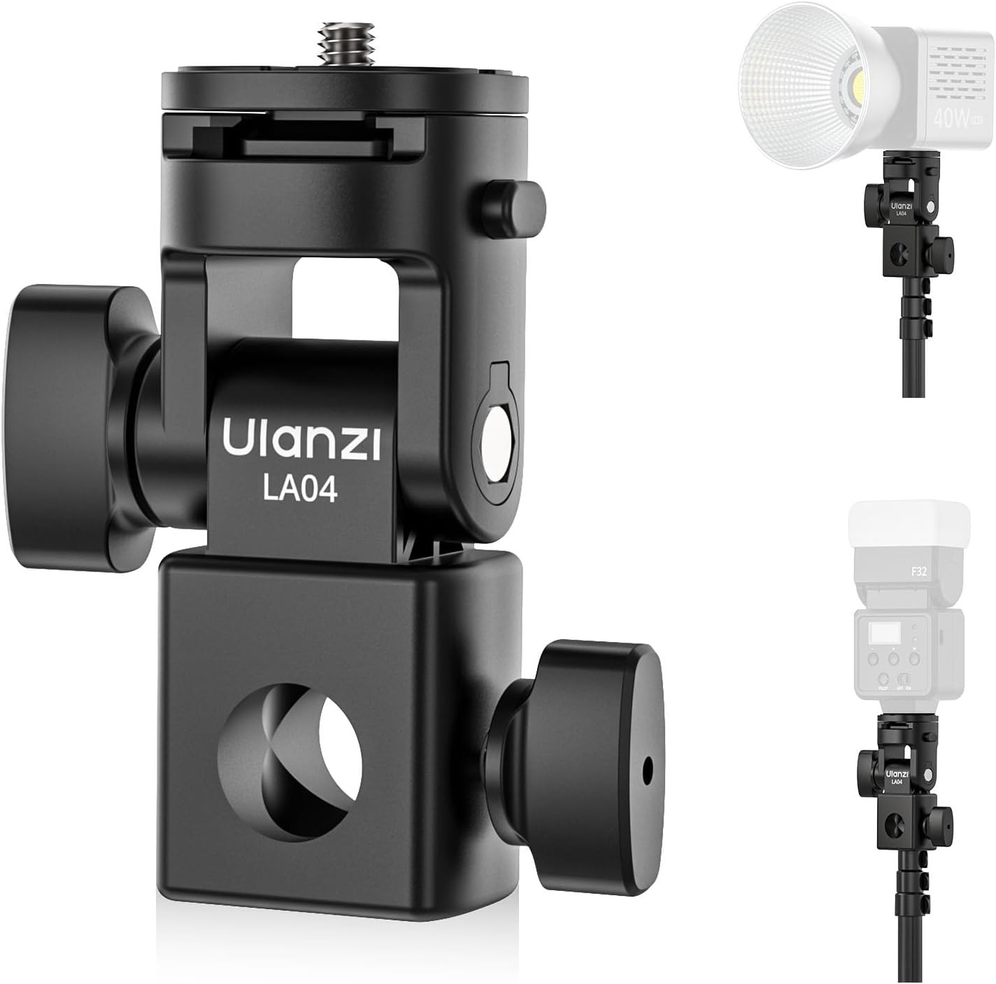 Ulanzi LA04 adapter za stalak za svjetlo je kompaktan, svestran dodatak koji vam omogućuje montiranje kamera, držača za telefone i video svjetala na standardne stalke za svjetla. S 1/4" vijkom, hladnim papučicama i mogućnošću nagiba od 180°, pruža fleksibilno pozicioniranje za fotografije i videozapise, a istovremeno ostaje lagan i prenosiv.