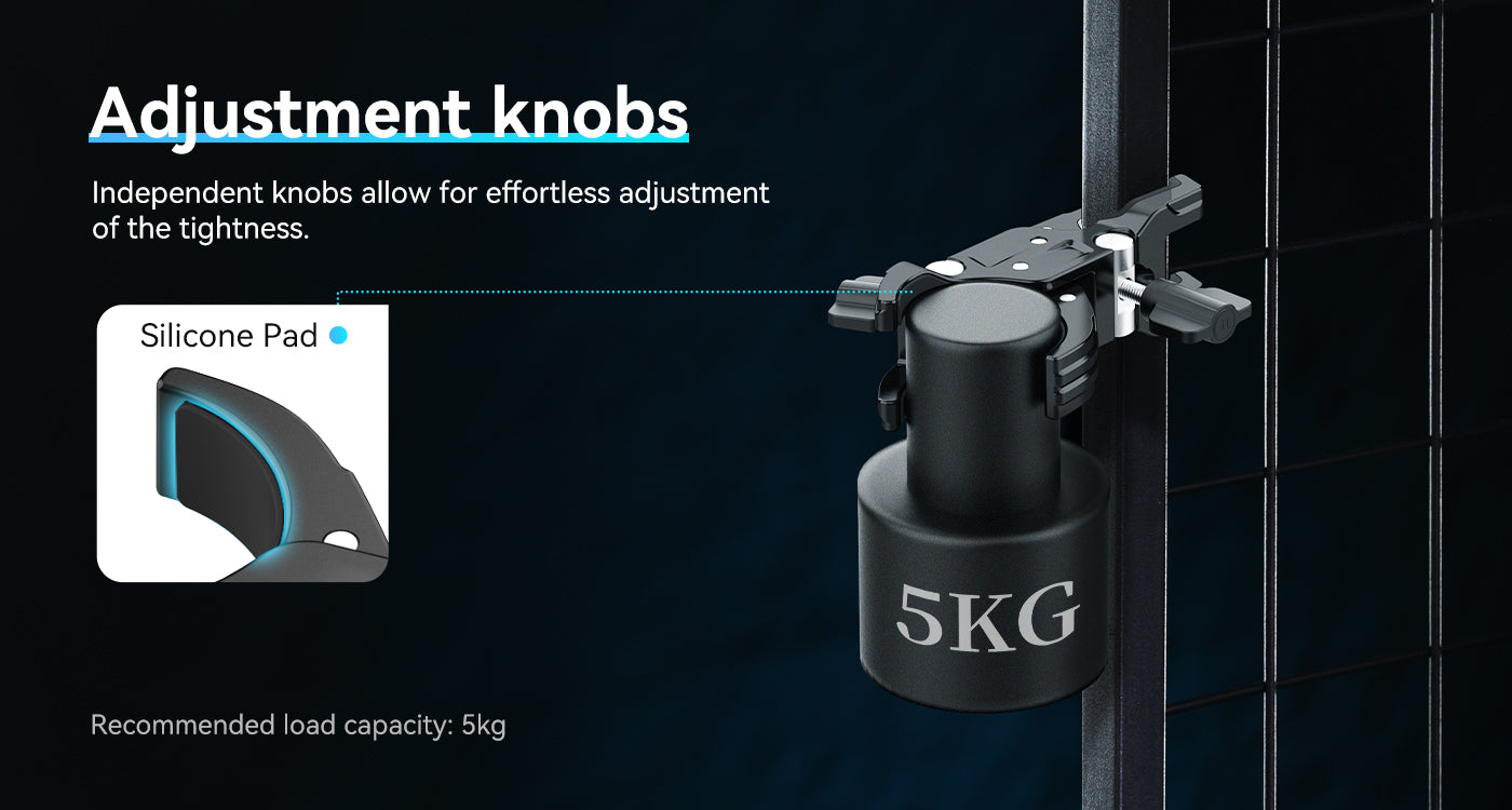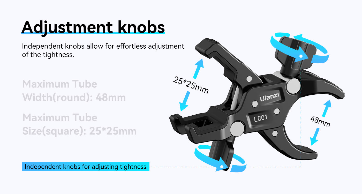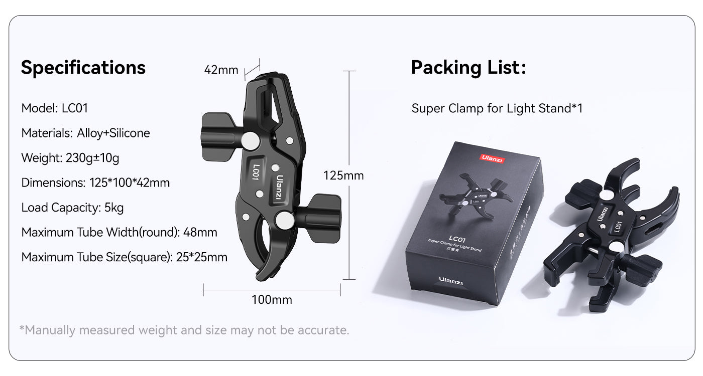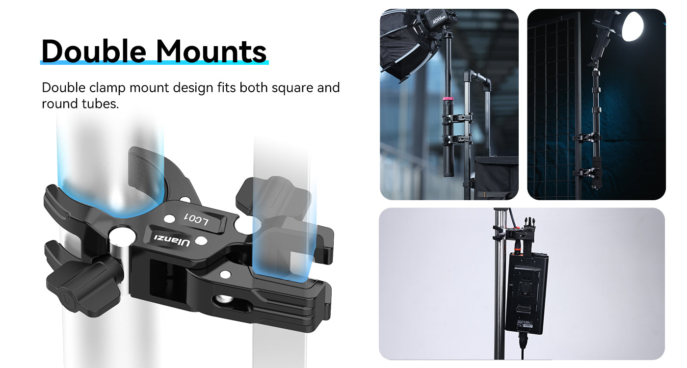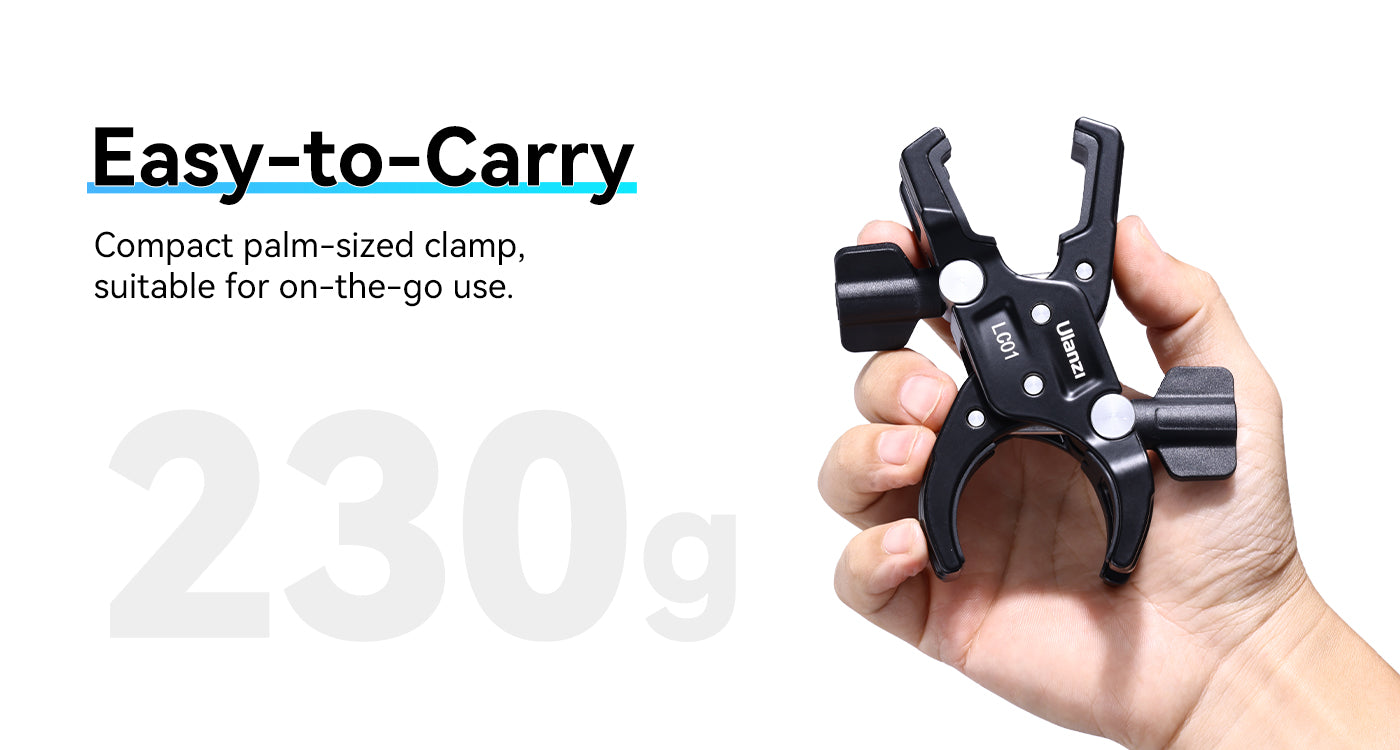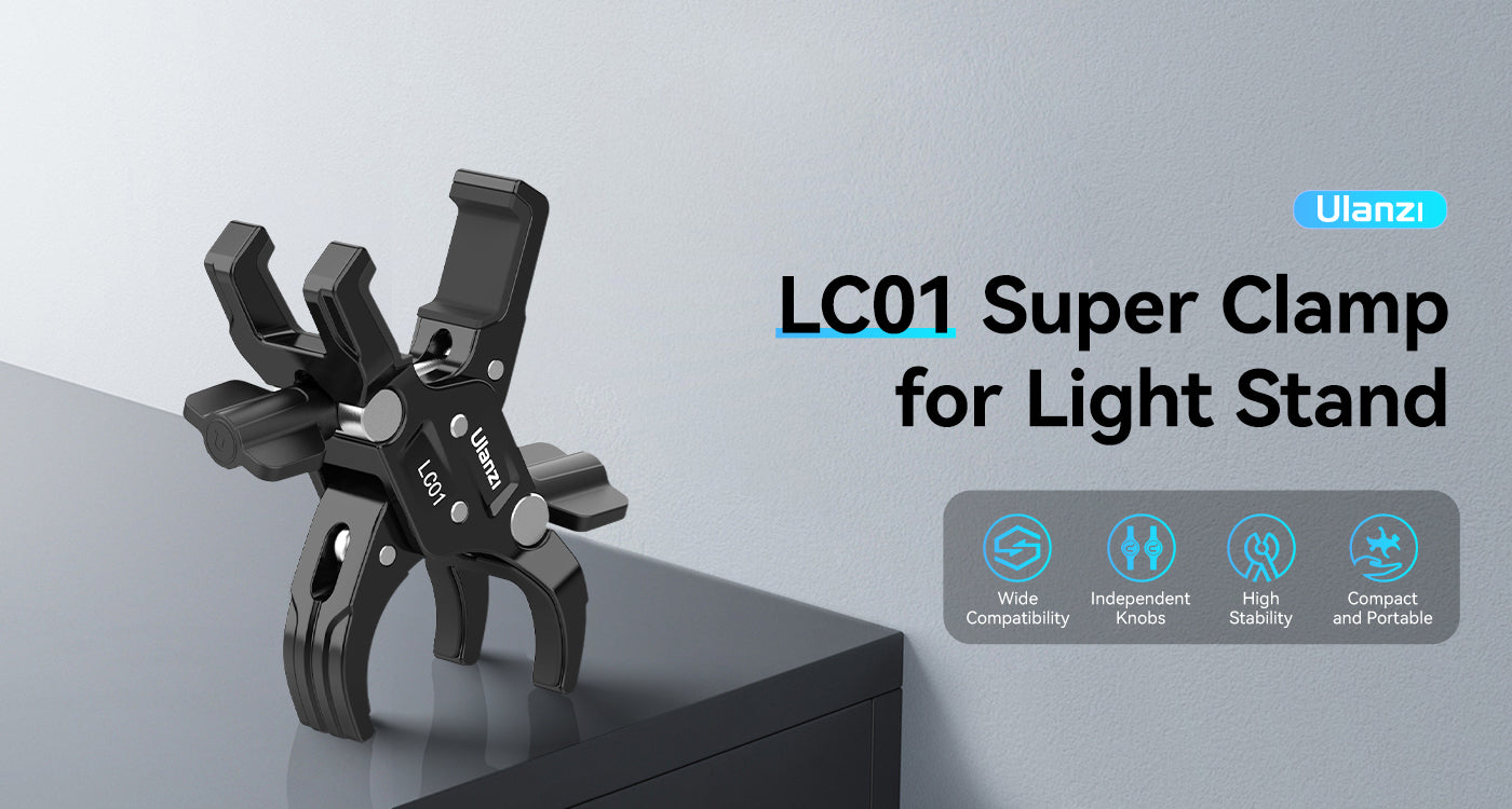 Ulanzi LC01 Super Clamp Mount je kompaktno, izdržljivo rješenje za pričvršćivanje opreme na stalke za svjetla, tronošce ili rigging postavke. S dvostrukim stezaljkama koje odgovaraju okruglim i četvrtastim cijevima, podržava do 5 kg opreme - savršeno za svjetla, kamere ili pribor. Izrađen od robusne legure i silikona visokog prianjanja, osigurava izuzetno čvrstu stabilnost. Idealan za mobilne kreatore i profesionalne studijske radnike, LC01 pruža preciznu kontrolu i prenosivost u jednom uređaju veličine dlana.