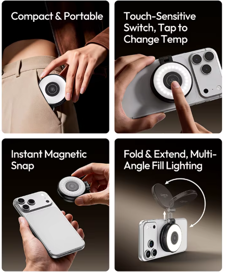Ulanzi LM21 magnetsko puno svjetlo (crno) je kompaktno i prenosivo mini prstenasto svjetlo kompatibilno s MagSafeom, dizajnirano za mobilnu fotografiju i stvaranje sadržaja. S podesivom temperaturom boje, visokim CRI-jem za precizno prikazivanje boja i laganim sklopivim dizajnom, pruža meko, prirodno osvjetljenje za selfieje, video pozive i snimanje u pokretu.