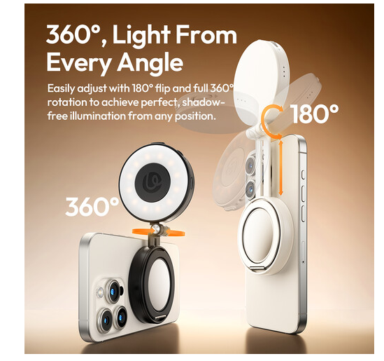 Inovativni dizajn s preklopnom konstrukcijom omogućuje nagib od 180° i punu rotaciju od 360°, što omogućuje precizno pozicioniranje svjetla. Također može funkcionirati kao ručka ili stalak za tablet, što ga čini idealnim za web-prijenose, telekonferencije, stvaranje sadržaja ili gledanje medija.