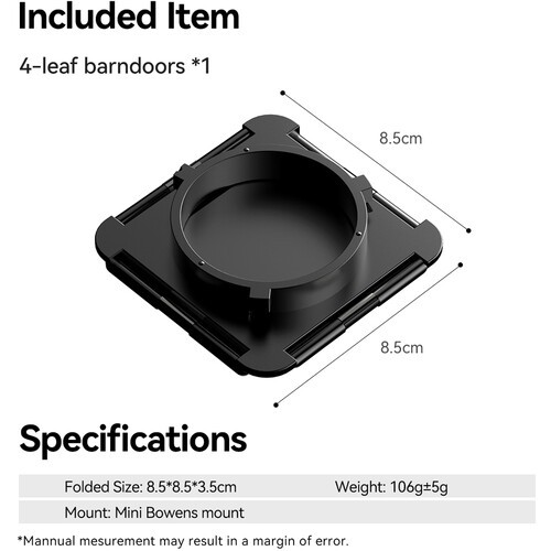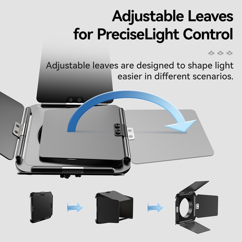 Ulanzi M4 barndoors s 4 listadizajnirane su kako bi kreatorima pružile preciznu kontrolu nad izlaznom svjetlošću pri korištenju kompatibilnih LED svjetala s Mini Bowens priključkom, kao što su Ulanzi L023 i L024. S četiri podesiva metalna lista, ove barndoors omogućuju oblikovanje, sužavanje ili blokiranje dijelova snopa svjetlosti kako biste istaknuli određena područja svoje scene, pojačali kontrast ili stvorili dramatične svjetlosne efekte.