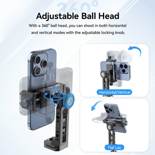 Ulanzi MA53 držač za telefon s kuglastom glavom pruža profesionalnu razinu fleksibilnosti i stabilnosti za kreatore pametnih telefona. Izrađen od izdržljivog aluminija, ovaj držač sigurno steže pametne telefone širine od 2,4 do 3,7 inča pomoću čeljusti obloženih silikonom koje štite vaš uređaj od ogrebotina i neželjenog pomicanja.