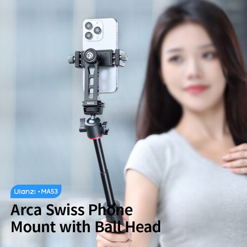 Ulanzi MA53 Arca Swiss držač za telefon robustan je aluminijski držač za pametne telefone s ugrađenom kuglastom glavom i bazom za brzo otpuštanje tipa Arca. Dizajniran za telefone širine 2,4–3,7 inča, nudi glatku rotaciju od 360°, pozicioniranje pod različitim kutovima i proširenje dodatnom opremom – idealan za mobilno snimanje filmova, prijenose uživo i fotografiju.