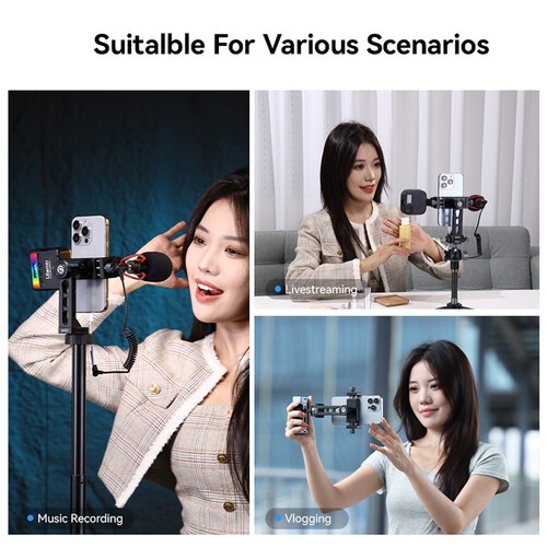 S više točaka za montažu — uključujući hladne cipele, navoje 1/4"-20, navoj 3/8"-16 i ARRI rupu za pozicioniranje — MA53 služi kao kompaktan mobilni čvorište za mikrofone, LED svjetla, monitore ili bežične prijamnike. Bilo da vlogate, snimate sadržaj za društvene mreže ili uživo prenosite, MA53 je moćno i svestrano rješenje za montažu na pametne telefone.