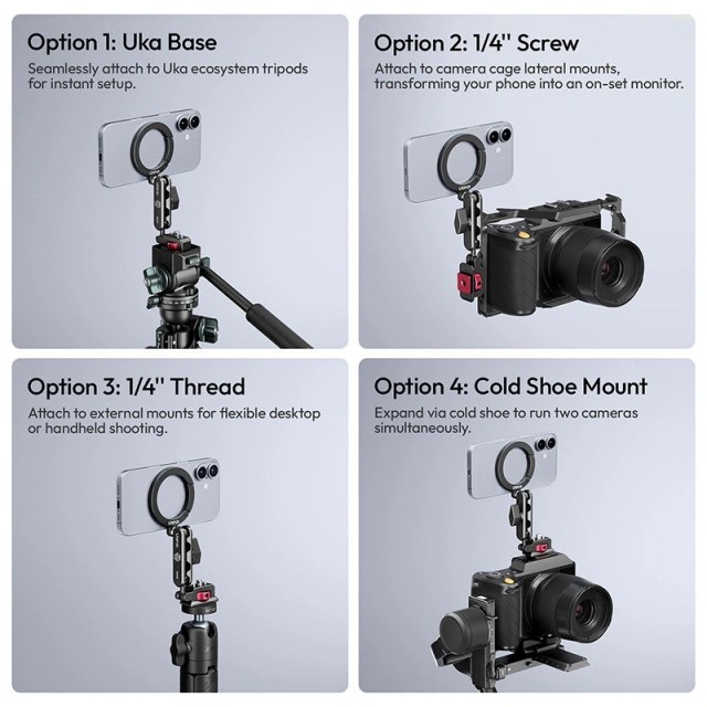 - Uka baza: Besprijekorno pričvrstite na stative iz Uka ekosustava za trenutačno postavljanje.