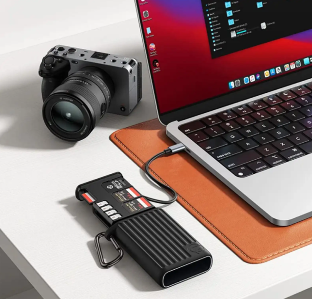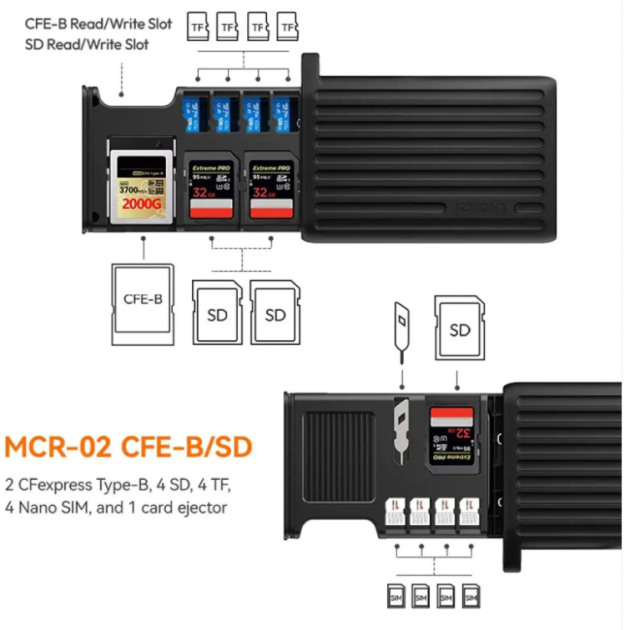 MCR 02 služi i kao organizator za pohranu kartica, s namjenskim utorima za 2 CFexpress Type B, 4 SD, 4 Micro SD (TF) i 4 Nano SIM kartice, te praktičnim izbacivačem kartica i adapterom. Napaja se putem USB-C OTG-a i omogućuje trenutačno dijeljenje datoteka s pametnim telefonima, tabletima i računalima. Njegov kompaktan dizajn, izrađen od legure aluminija, ABS-a i silikona, osigurava izdržljivost, a istovremeno je lagan, teži 205 g.
