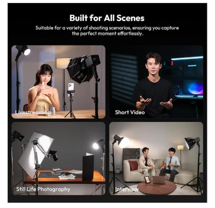 Dizajniran za fleksibilnost, ML100Bi ima neprekidno prigušivanje, što omogućuje preciznu kontrolu svjetline pomoću glatke kontrolne tipke, dok LCD zaslon pruža povratne informacije u stvarnom vremenu za precizno podešavanje rasvjete. Dvobojni izlaz omogućuje jednostavno prilagođavanje različitim uvjetima osvjetljenja, čineći ga pogodnim za snimanje u zatvorenom i na otvorenom.