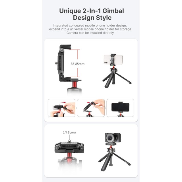 Ulanzi MT-41 4-dijelni teleskopski mini stativ V2 dizajniran je za kreatore kojima je potrebna svestranost u kompaktnom formatu. Ovaj stolni stativ ima teleskopsku središnju stupicu koja se proteže do 17,7 inča (45 cm), omogućujući mu da funkcionira i kao stabilan mini stativ i kao praktičan selfie stick. Njegova integrirana kuglasta glava omogućuje glatko ručno podešavanje s nagibom do 90° u vertikalnom smjeru, što olakšava prebacivanje između horizontalnog i vertikalnog snimanja.