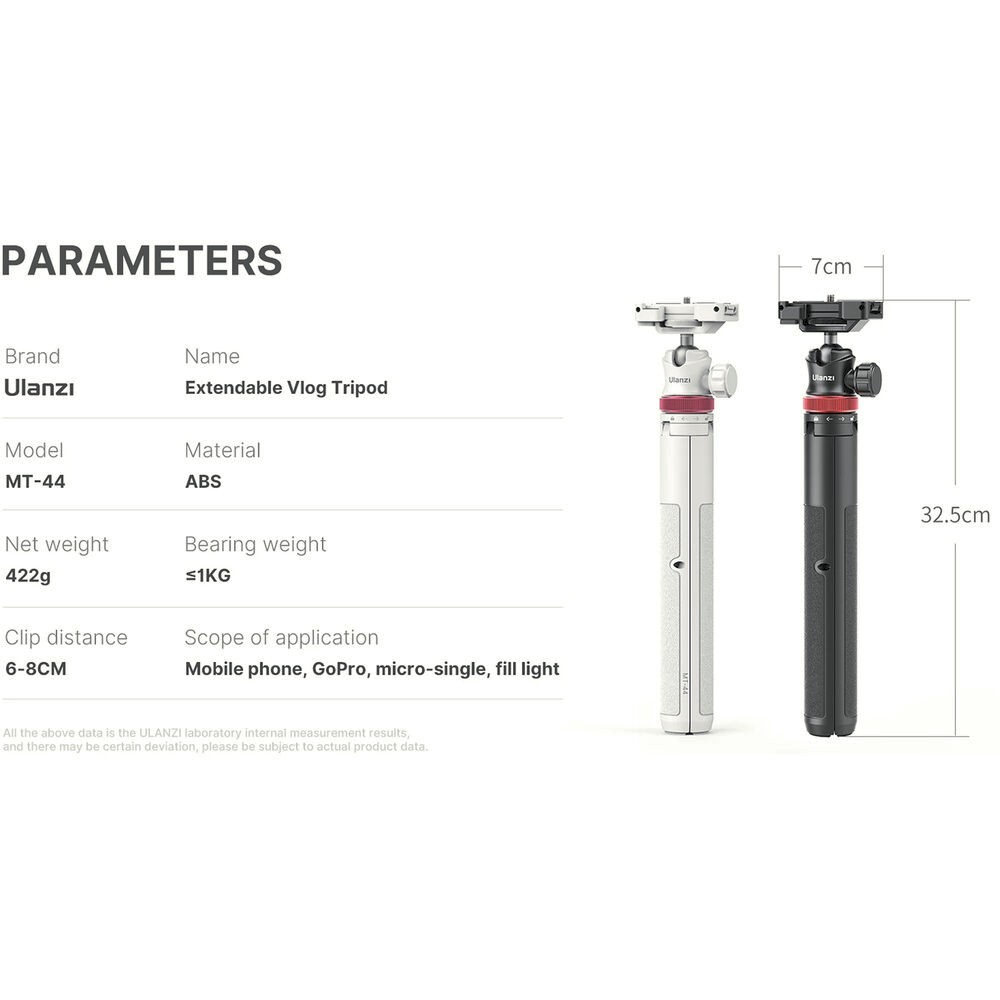 Ulanzi MT-44 produživi vlog stativ (bijeli) V2 dizajniran je za vlogere, kreatore sadržaja i putnike kojima je potreban kompaktan, ali svestran stativ. Njegova aluminijska središnja stupanjska kolona s 6 sekcija i zaključavanjem uvijanjem proteže se od 13,8" (35 cm) do 58,7" (149 cm), omogućujući upotrebu kao stolni stativ, puni stativ ili selfie štap. Težak samo 0,9 lb (422 g), lako ga je nositi, a istovremeno podnosi uređaje do 2,2 lb (1 kg).