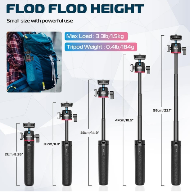 Ulanzi MT-73 Mini selfie stativ je svestrano i kompaktno rješenje za kreatore kojima su potrebni stabilnost i fleksibilnost u pokretu. S dizajnom od 5 odjeljaka koji se može podesiti, proteže se do 55 cm, što ga čini jednostavnim za prilagodbu različitim kutovima snimanja i scenarijima. Kuglasta glava od 360 stupnjeva omogućuje glatko prebacivanje između vodoravne i okomite orijentacije, dajući vam potpunu kreativnu slobodu.
