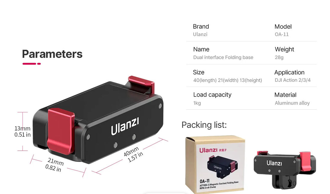 Izrađena od laganog i čvrstog aluminijskog legura, sklopiva baza podnosi opterećenje do 1 kg (2,2 lbs), osiguravajući trajnost bez dodavanja nepotrebne težine. Njezine tanke dimenzije i težina od 28 grama čine je iznimno prenosivom za akcijsku videografiju, putovanja ili snimanje na otvorenom.