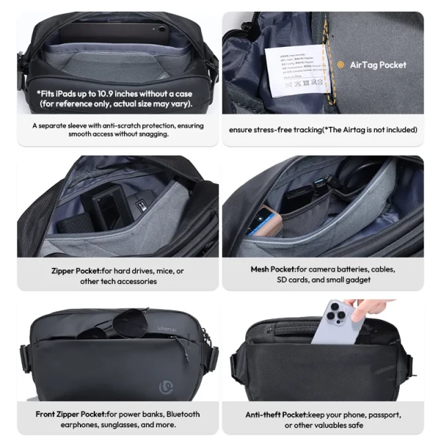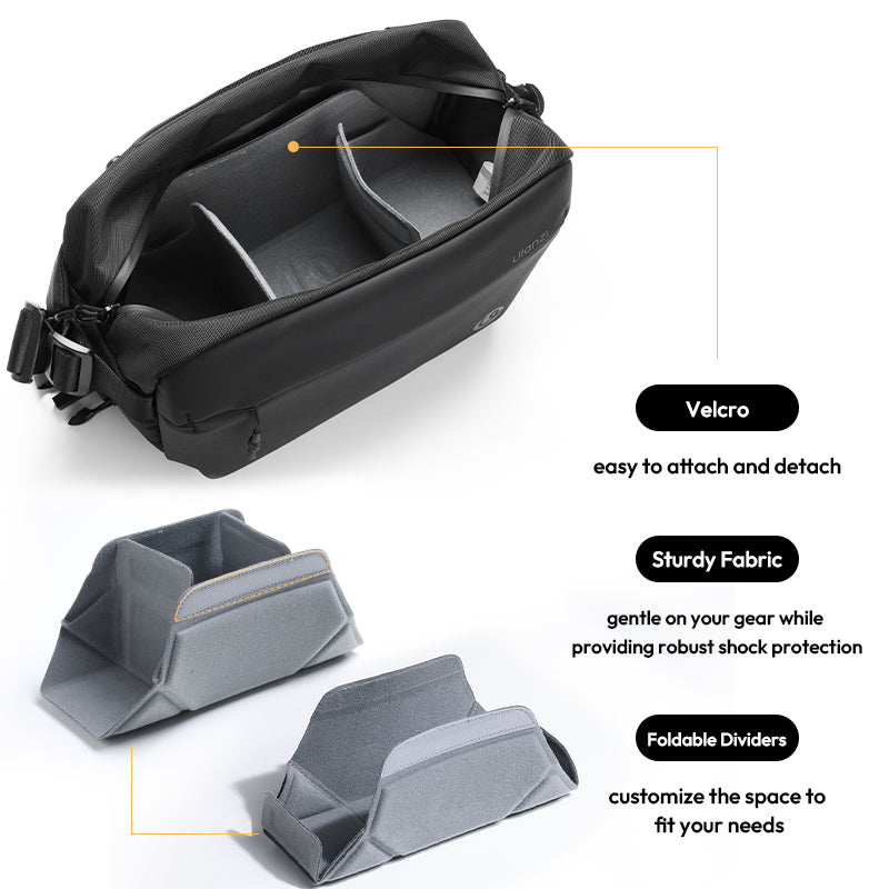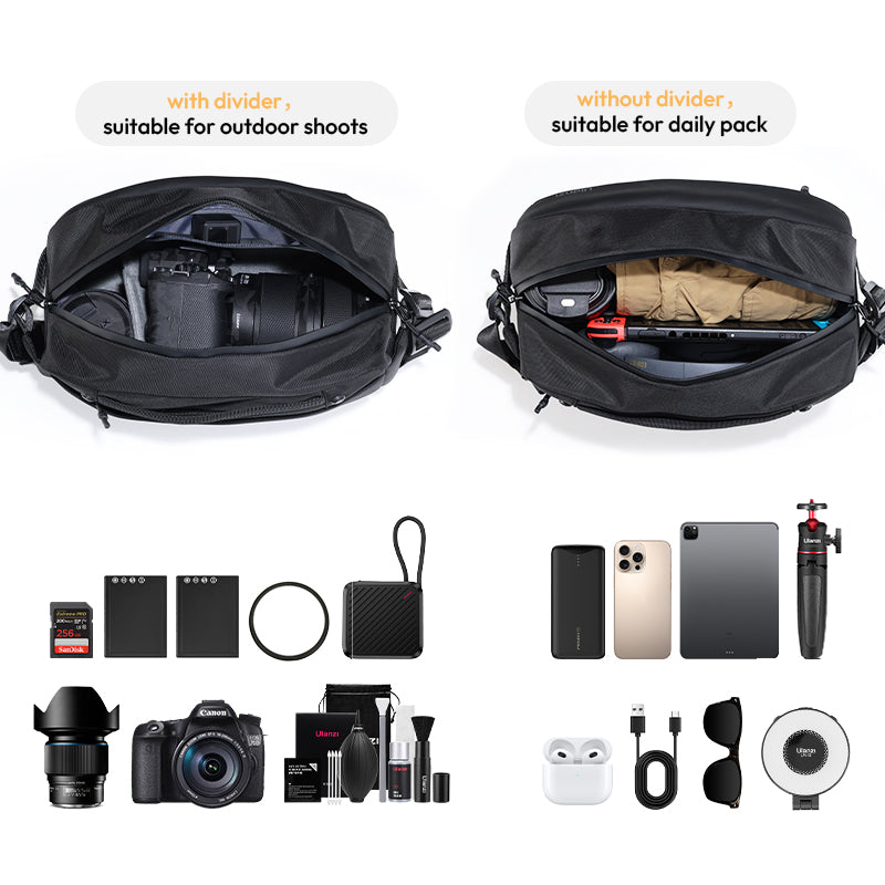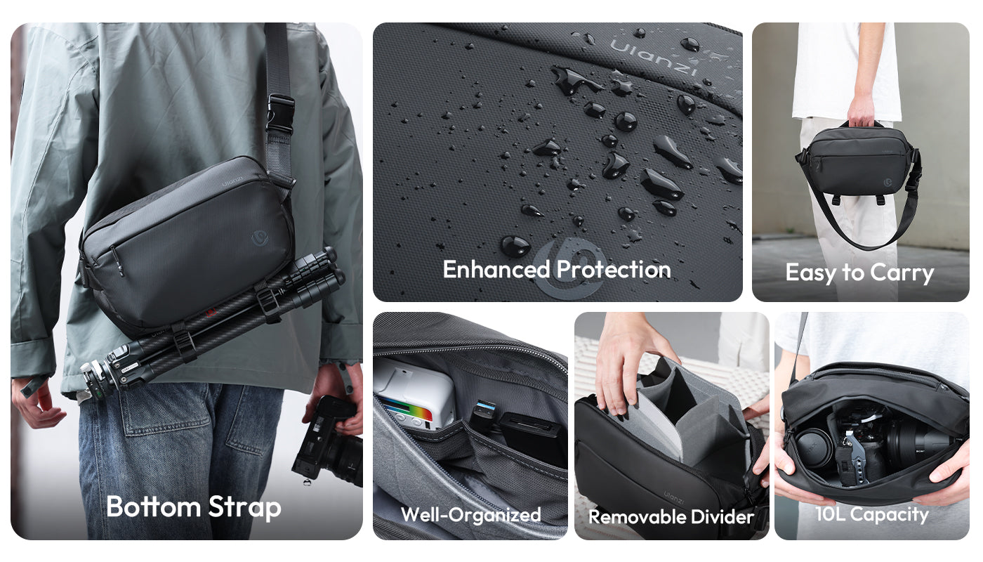 Ulanzi B120 torba za kameru nudi 10 l organiziranog prostora za pohranu za fotografe i putnike. Izrađena od tkanine otporne na prskanje i izdržljivih patentnih zatvarača, štiti vašu opremu u svim vremenskim uvjetima. Više pretinaca, džep za tablet i odvojivi pretinac olakšavaju prebacivanje između nošenja za kameru i svakodnevne upotrebe. S podesivim donjim remenom za stativ, ova lagana torba preko tijela savršena je za gradska snimanja, planinarenja ili vikend izlete.