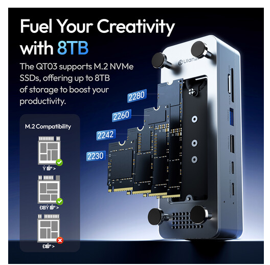 Docking stanica Ulanzi A050 QT03 s kućištem za SSD visokih performansi, sve-u-jednom rješenje dizajnirano za optimizaciju vašeg radnog prostora, nudeći izvrsne mogućnosti povezivanja, pohrane i hlađenja. S podrškom za USB4 za iznimno brze brzine prijenosa podataka do 40 Gb/s, ova doking stanica osigurava neometan pristup datotekama i munjevitu izvedbu. Sadrži pretinac za opcionalni M.2 NVMe SSD (do 8 TB), nudeći dodatni prostor za pohranu onima kojima je potreban. Jedinica također podržava 4K video izlaz putem HDMI 4K60, savršen za povezivanje s monitorima ili televizorima.