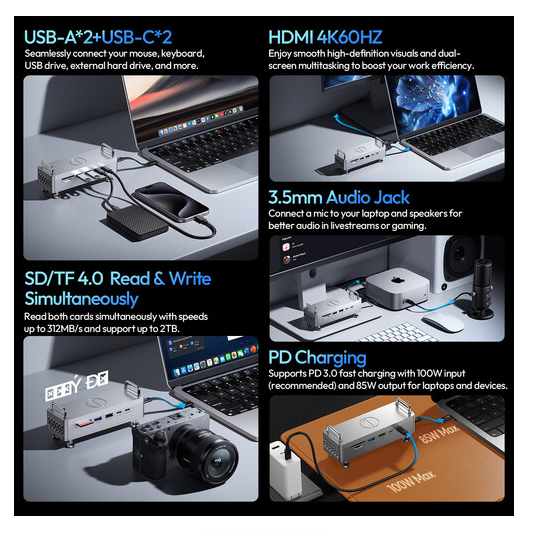 Ulanzi A050 QT03 Docking Station je svestrana i brza USB4 doking stanica s kućištem za M.2 NVMe SSD, koja nudi do 8 TB dodatnog prostora za pohranu. Podržava brzine prijenosa do 40 Gb/s, ima HDMI 4K60 video izlaz, više USB priključaka, utore za SD/microSD kartice i 3,5 mm audio priključak. Sa svojim ugrađenim ventilatorom i aluminijskim kućištem, osigurava optimalno hlađenje i performanse na sustavima macOS, Windows, Linux i Android.