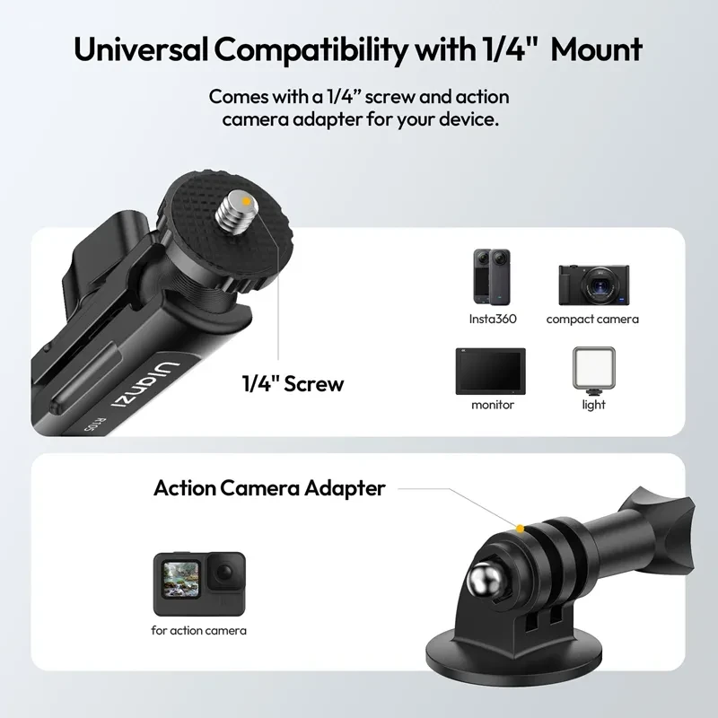 Ulanzi R105 stezaljka za biciklističku šinu C057 je robusni, metalni nosač za kameru dizajniran za bicikliste i kreativce na otvorenom. S trostrukim hvatištem i protukliznim gumenim jastučićima , pruža neusporedivu stabilnost na upravljaču, šinama ili ravnim površinama. Gumb prilagođen rukavicama lako se podešava od 12 do 55 mm, dok dvostruka kuglasta glava od 360° nudi potpunu rotaciju i nagib za dinamične kutove snimanja. Kompatibilan je s uređajima s vijcima od 1/4" i akcijskim kamerama u stilu GoPro-a , podržava do 1 kg - savršeno za kompaktne kamere, svjetla ili monitore.