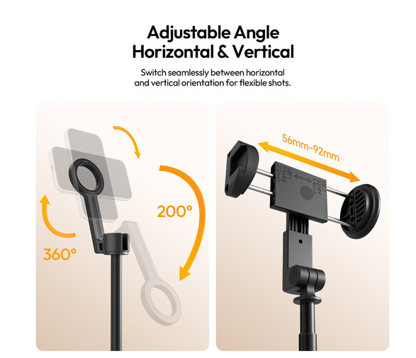 S maksimalnom dužinom izduženja do 154 cm, ovaj selfie stick pruža izvrstan doseg za široke grupne fotografije i povišene perspektive. Podesiva glava podržava rotaciju od 360° i nagib od 200°, što omogućuje neprimjetno prebacivanje između vodoravnog i okomitog načina snimanja za maksimalnu kreativnu kontrolu.