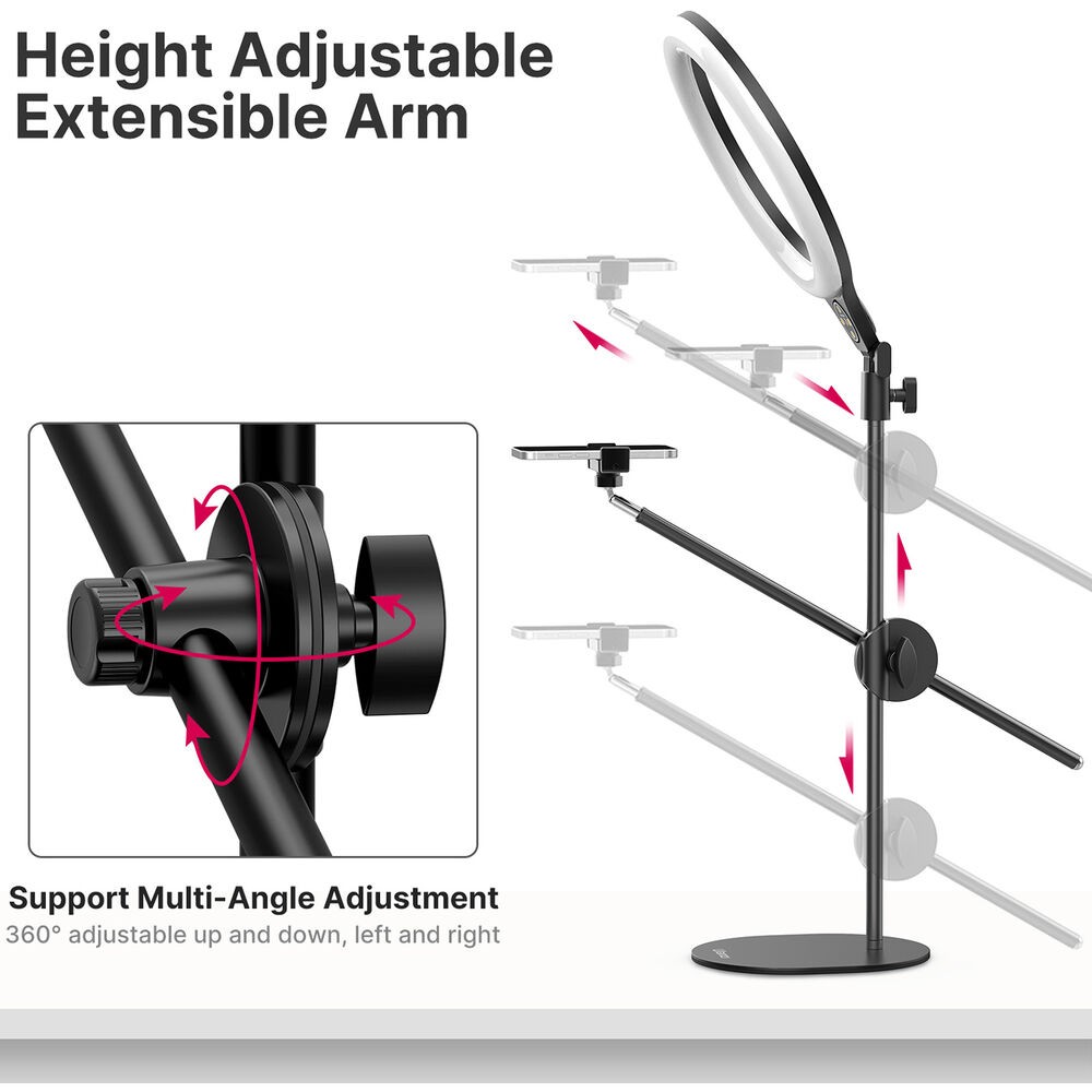 Set Ulanzi T1 Desktop Overhead Shooting Bracket Ring Light omogućuje kreatorima precizno i fleksibilno osvjetljavanje i snimanje subjekata odozgo. Njegova 10-inčna LED prstenasta svjetiljka nudi podesivu temperaturu boje od 3500K (topla) do 6500K (dnevna svjetlost) i 11 razina jačine svjetla, osiguravajući optimalno osvjetljenje za različite scenarije. Stalak se proteže do 32 inča i ima dvije neovisno podesive potporne šipke za svjetlo i pametni telefon, svaka sposobna nagibati se i rotirati 360° za precizno pozicioniranje.