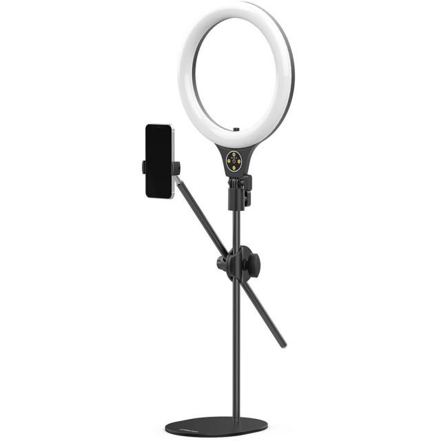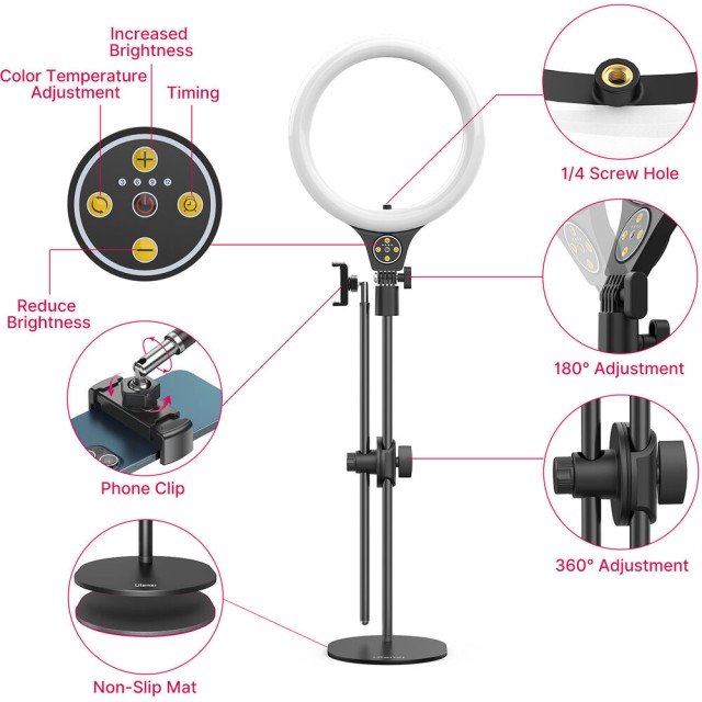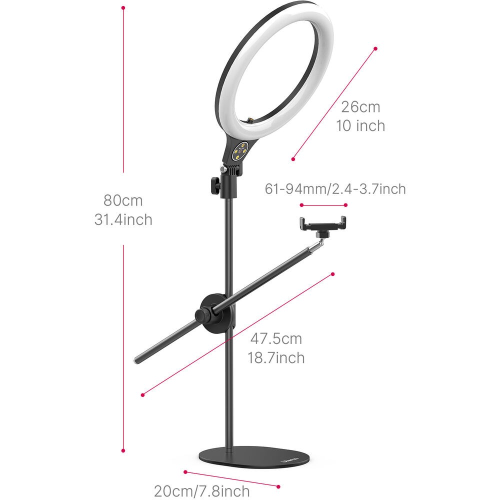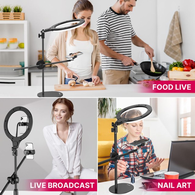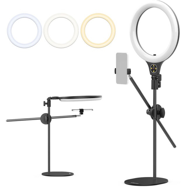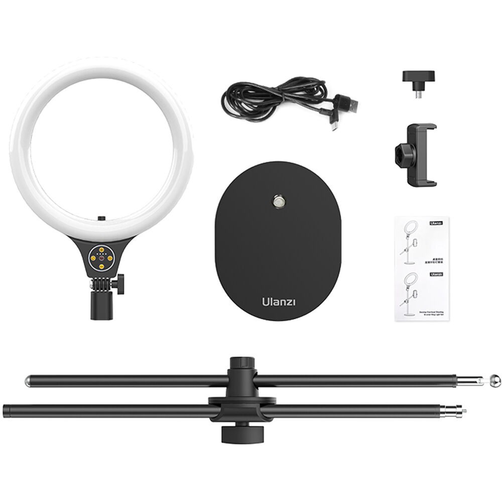 Ulanzi T1 komplet prstenaste svjetiljke za snimanje odozgo sastoji se od 10-inčne LED prstenaste svjetiljke s podesivom visinom do 32 inča za osvjetljenje odozgo. S temperaturom boje od 3500–6500 K, 11 razina svjetline i ugrađenim držačem za telefon, idealna je za vlogove o hrani, ljepoti i modi ili za stvaranje sadržaja na stolu.