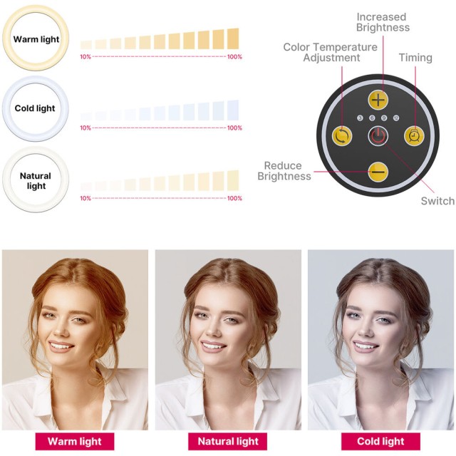 Držač za telefon podržava većinu pametnih telefona, a set se može koristiti i uspravno za osvjetljavanje lica prezentera za vlogove ili tutorijale. Napajana putem USB-a (2–5 VDC), svjetiljka je jednostavna za korištenje bilo gdje uz računalo, power bank ili USB adapter. Njezina lagana i čvrsta konstrukcija od plastike i čelika čini je izdržljivim, ali prenosivim rješenjem za kreatore koji traže osvjetljenje odozgo.