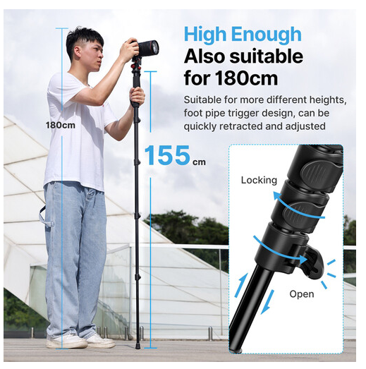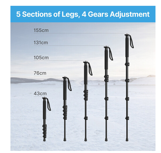 Ulanzi aluminijski monopod (61") je lagana, svestrana potpora za kamere i uređaje do 11 lbs. S maksimalnom visinom od 61" i sklopljenom duljinom od 17", ovaj monopod ima sustav zaključavanja nogu u 5 sekcija, dvostruke navoje za vijke 1/4"-20 i 3/8"-16 te udobnu pjenastu ručku. Savršen za upotrebu i kao selfie štap i kao monopod, dizajniran je za stabilnost, prenosivost i jednostavnost korištenja u različitim situacijama snimanja.