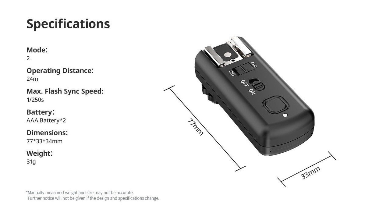 S dvopojasnom kontrolom (CH0 / CH1), TT-01 vam omogućuje upravljanje više blica na istom kanalu, što ga čini idealnim za postavke s više svjetala. Njegov univerzalni dizajn s jednom kontaktnom stopicom (hot shoe) osigurava široku kompatibilnost s većinom vodećih marki fotoaparata, omogućujući istovremeno aktiviranje bez kompliciranih postavki.