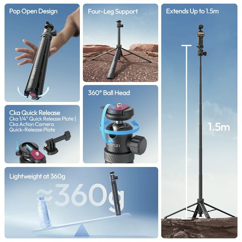 Ulanzi TT24 Cka selfie štap s brzim otpuštanjem dizajniran je za kreatore koji zahtijevaju brzinu, stabilnost i fleksibilnost. Njegov dizajn "od pada do spremnosti" odmah se otvara s četiri neklizajuća nogara, pružajući stabilan postanak na podu. Univerzalna kuglasta glava omogućuje glatku rotaciju od 360° i brzo prebacivanje između portretnog i pejzažnog načina rada.