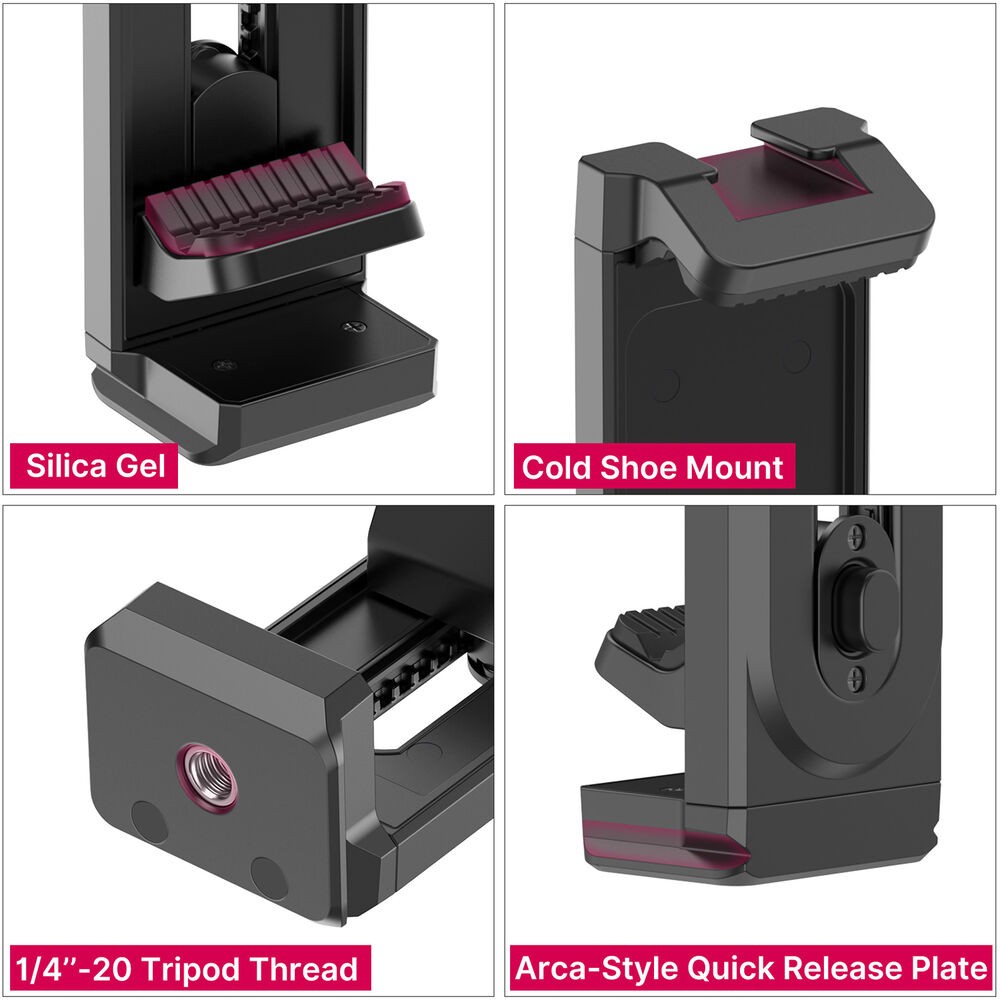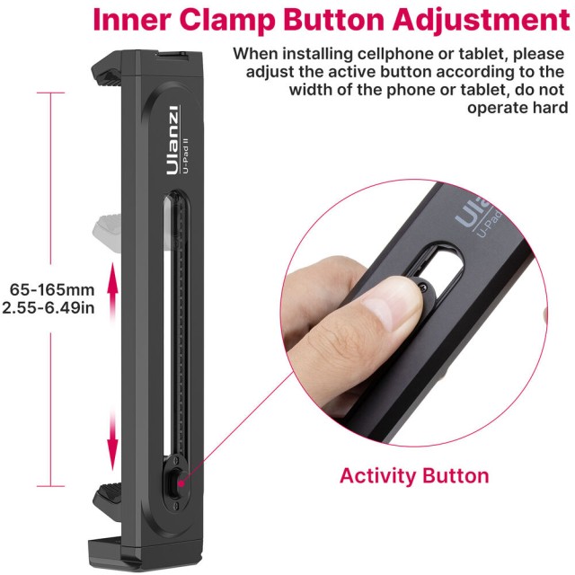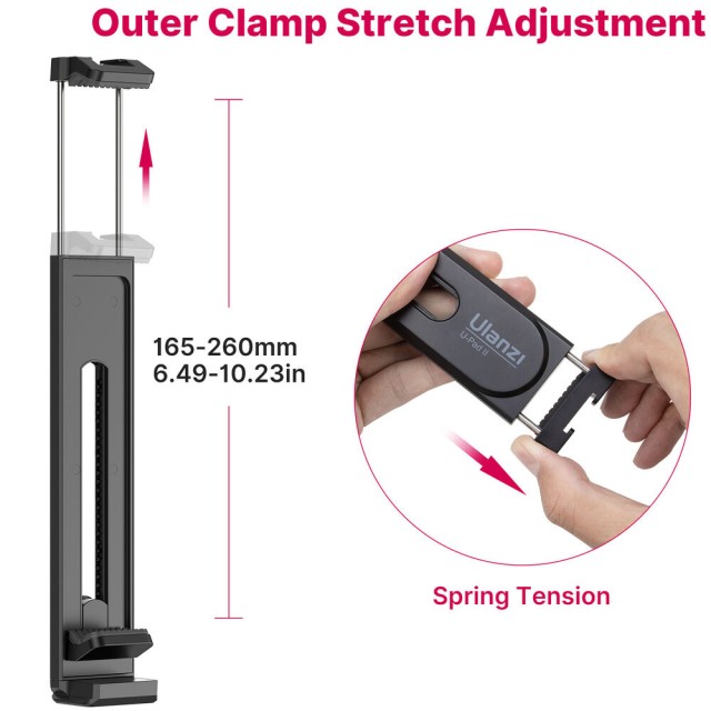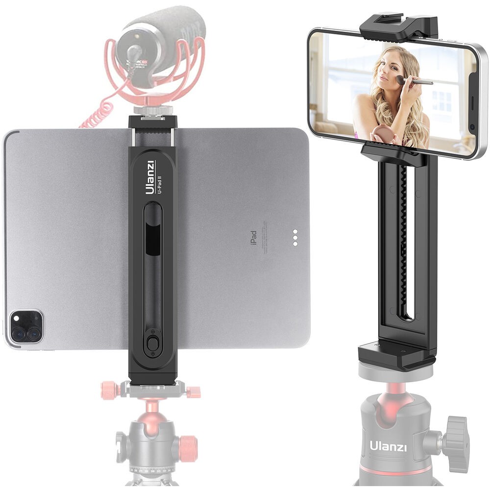 Ulanzi U-Pad II je svestrana stezaljka za stativ koja sigurno drži pametne telefone ili tablete širine od 2,6 do 10,2 inča, s gumbom za otpuštanje i opružnim stezaljkama, nosačima od 1/4" i Arca-style, te gornjom hladnom stopicom za dodatke.