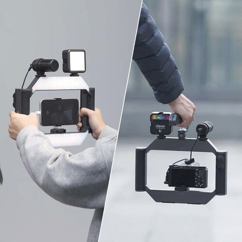 Ulanzi U-Rig video rig za pametne telefone s osvjetljenjem je rješenje s dvostrukim držačem i dvoslojnom LED rasvjetom, dizajnirano za poboljšanje stabilizacije i osvjetljenja za mobilne kreatore sadržaja. S podesivom temperaturom boje od 2500 do 9000 K, ugrađenom punjivom baterijom i bežičnim daljinskim upravljačem, idealan je za vloganje, intervjue, prijenos uživo i video produkciju u pokretu.