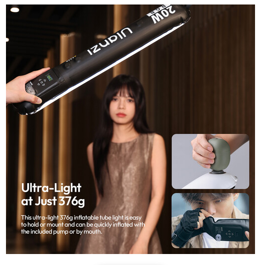 Ulanzi UA20C je fleksibilna, napuhiva RGB tuba za osvjetljenje namijenjena fotografima, videografima i kreatorima sadržaja. Lagana, prenosiva i magnetska, ova tuba duljine 60 cm pruža osvjetljenje punog spektra od 1800 K do 10 000 K uz preciznu kontrolu nijanse, zasićenja i intenziteta.