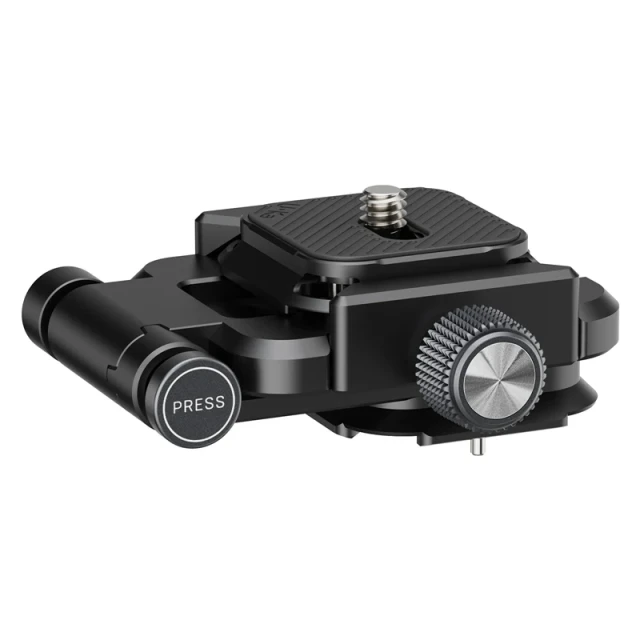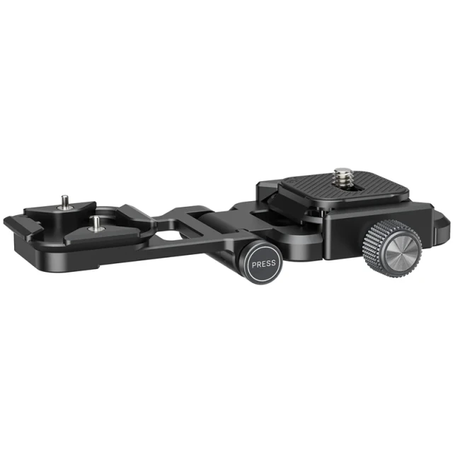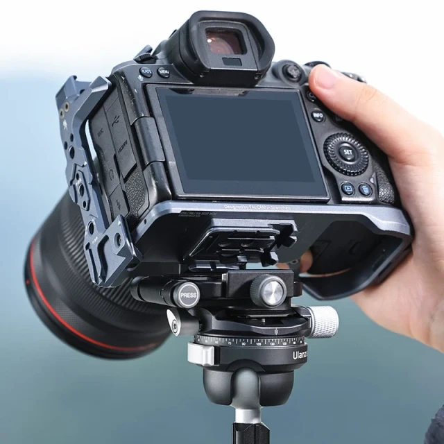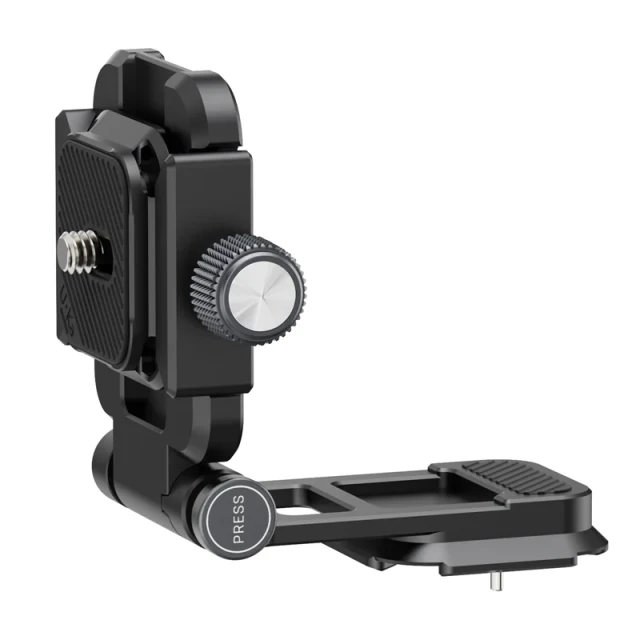 Sklopivi L-nosač. Brzo prebacivanje u vertikalno i vertikalno snimanje. Jednostavno prebacivanje s horizontalnog na vertikalno snimanje pritiskom na gumb. Kompatibilno s većinom ploča za brzo otpuštanje. Lako zaključavanje i otključavanje okretnim gumbom.