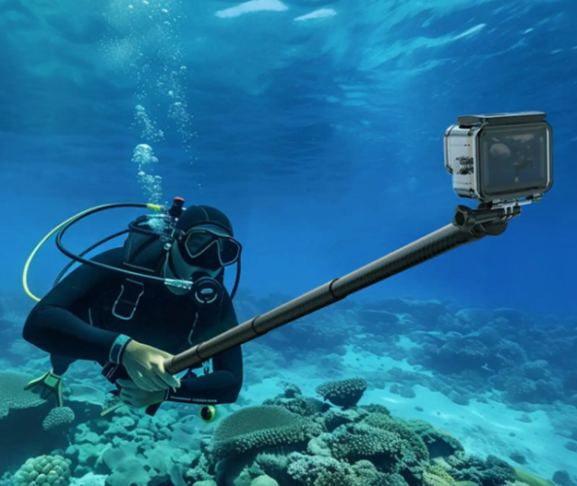 Selfie štap ima neklizajuću silikonsku dršku i uključuje narukvicu za dodatnu sigurnost tijekom upotrebe. Izrađen za svestranost, pouzdano radi u zahtjevnim okruženjima, uključujući i podvodno snimanje, što ga čini idealnim za putovanja, sport, vloganje i avanture na otvorenom. (Nakon upotrebe u morskoj vodi preporučuje se ispiranje slatkom vodom.)