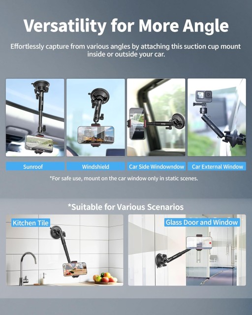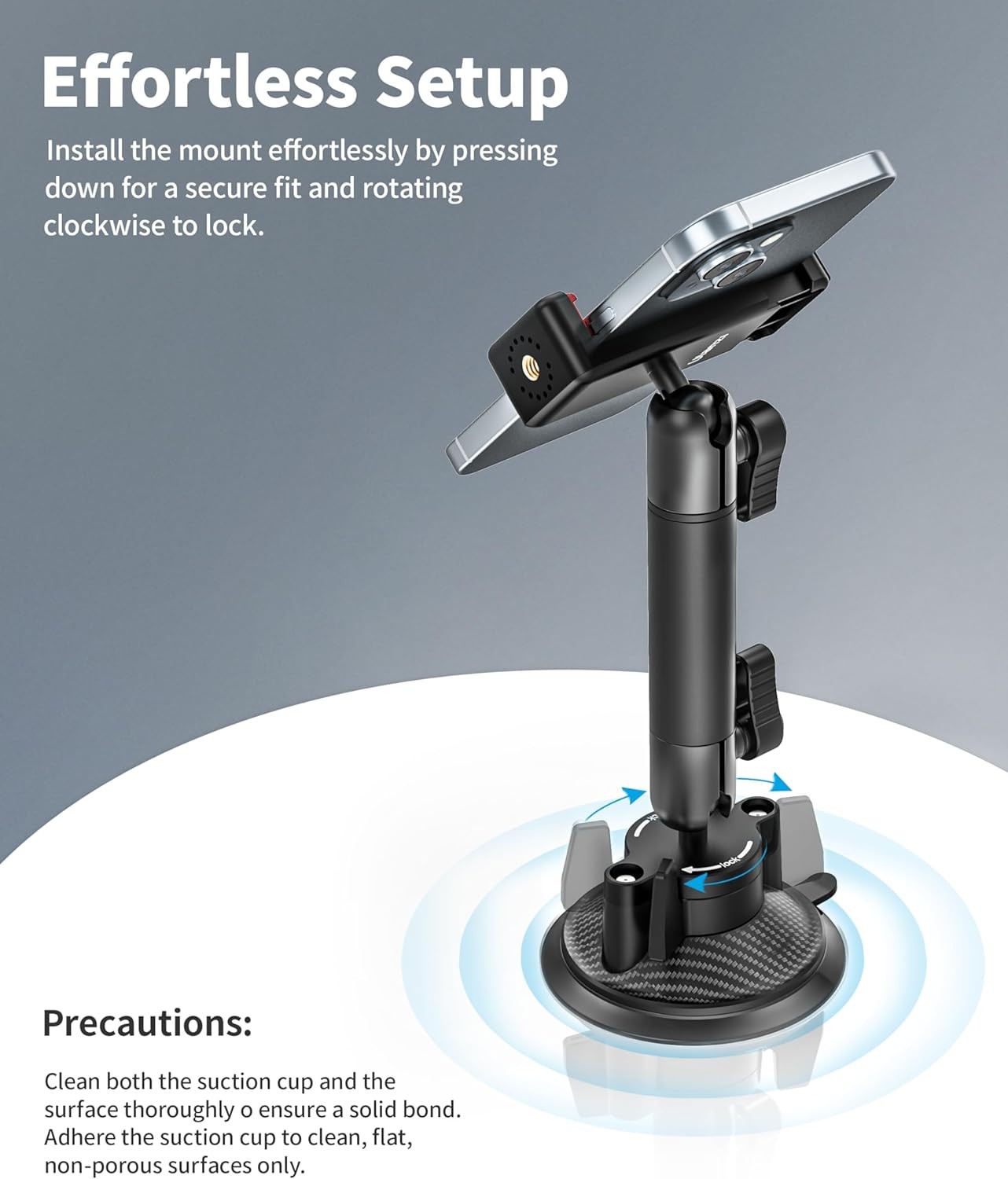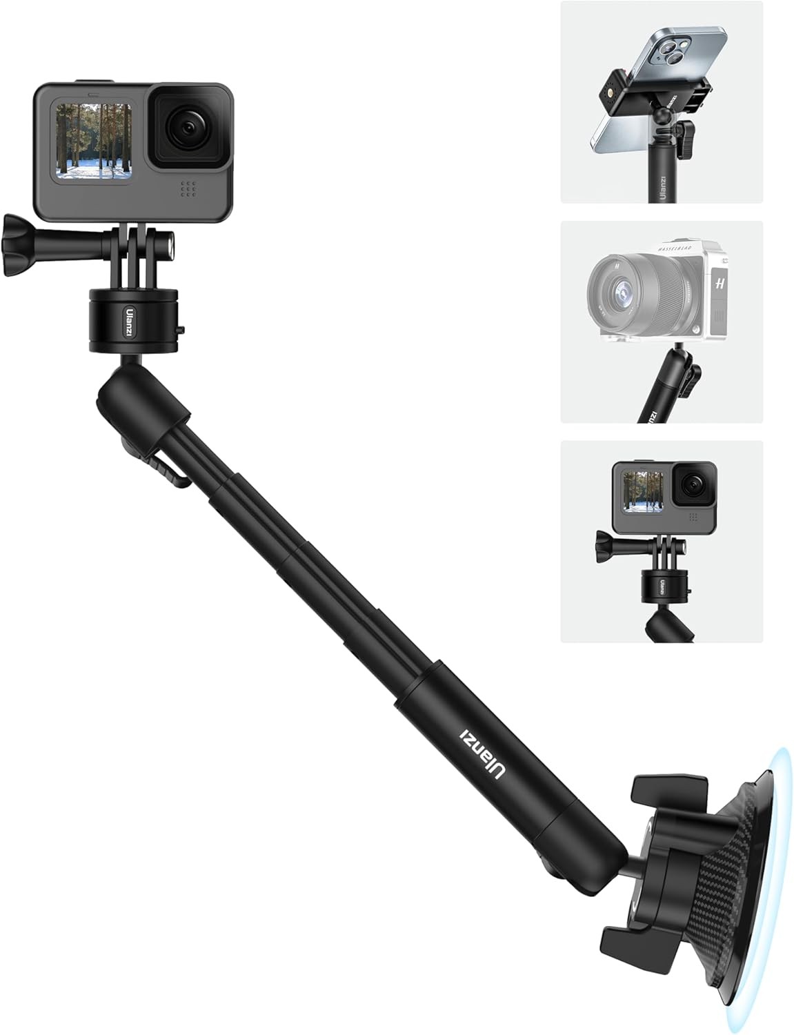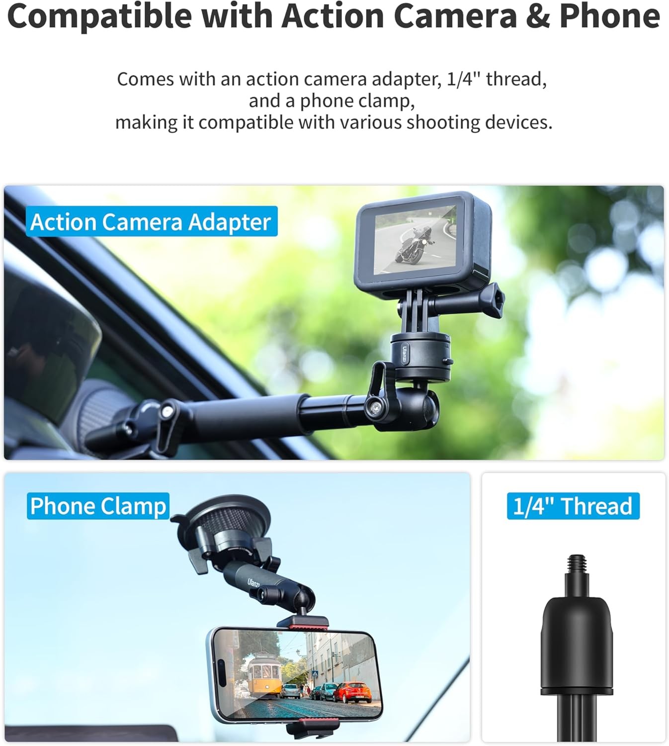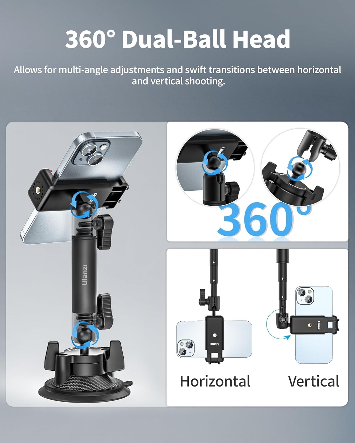 Ulanzi ZJ01 magnetski držač s usisnom čašom je svestran i brzo montirajući držač za kamere i pametne telefone, koji se odlikuje snažnom usisnom čašom, dvostrukom kuglastom glavom od 360° i podesivom teleskopskom rukom za dinamične kutove snimanja kako u zatvorenom prostoru, tako i na vozilima.
