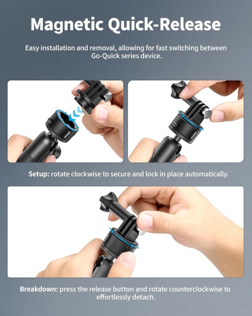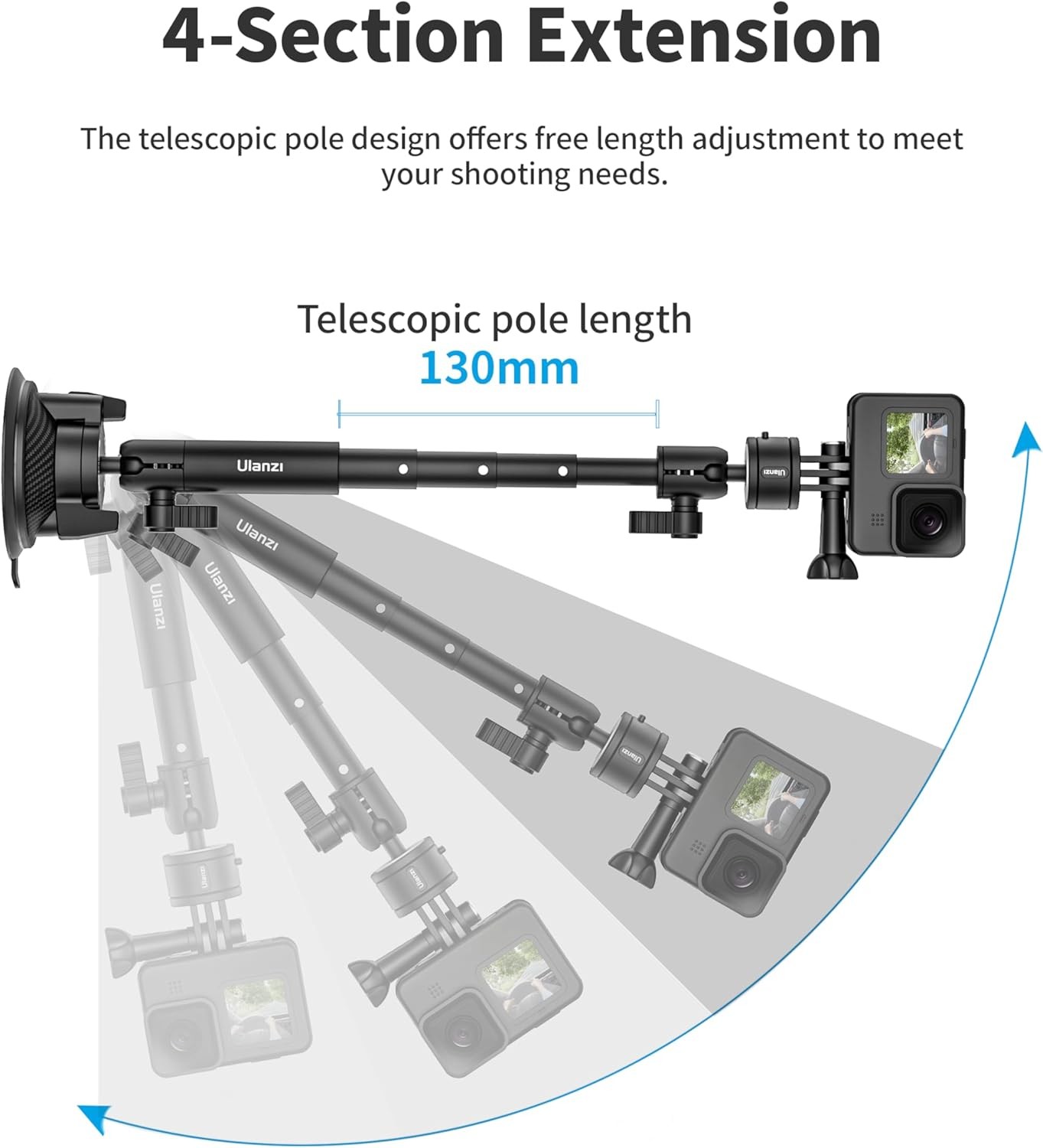 Teleskopski krak držača uključuje četiri produžne šipke koje omogućuju podešavanje do 5,12 inča kako biste postigli savršenu perspektivu bez obzira na postavljanje na površinu. Idealno za POV video, montažu na vozilo, stolne postavke ili fleksibilno snimanje u zatvorenom i na otvorenom, ZJ01 kombinira stabilnost, svestranost i praktičnost za kreatore sadržaja u pokretu.