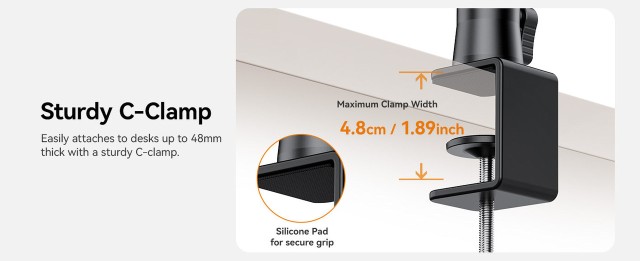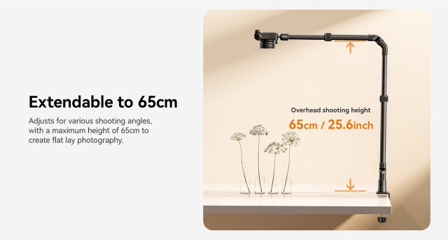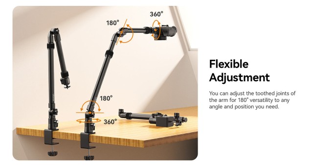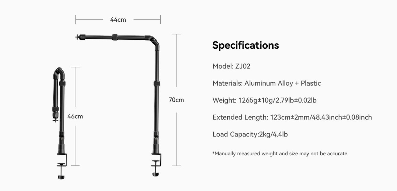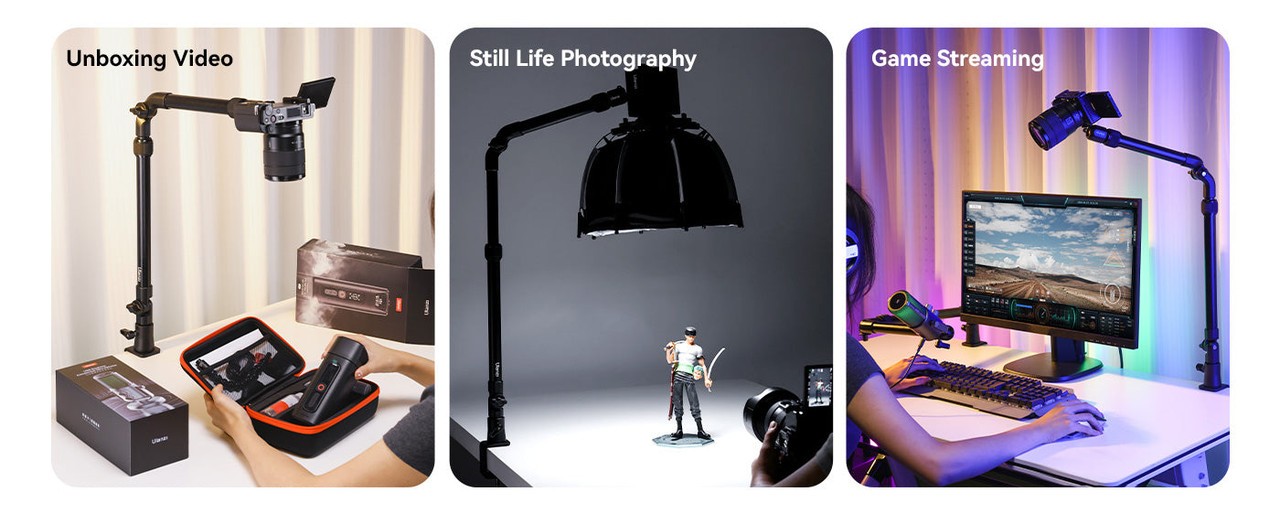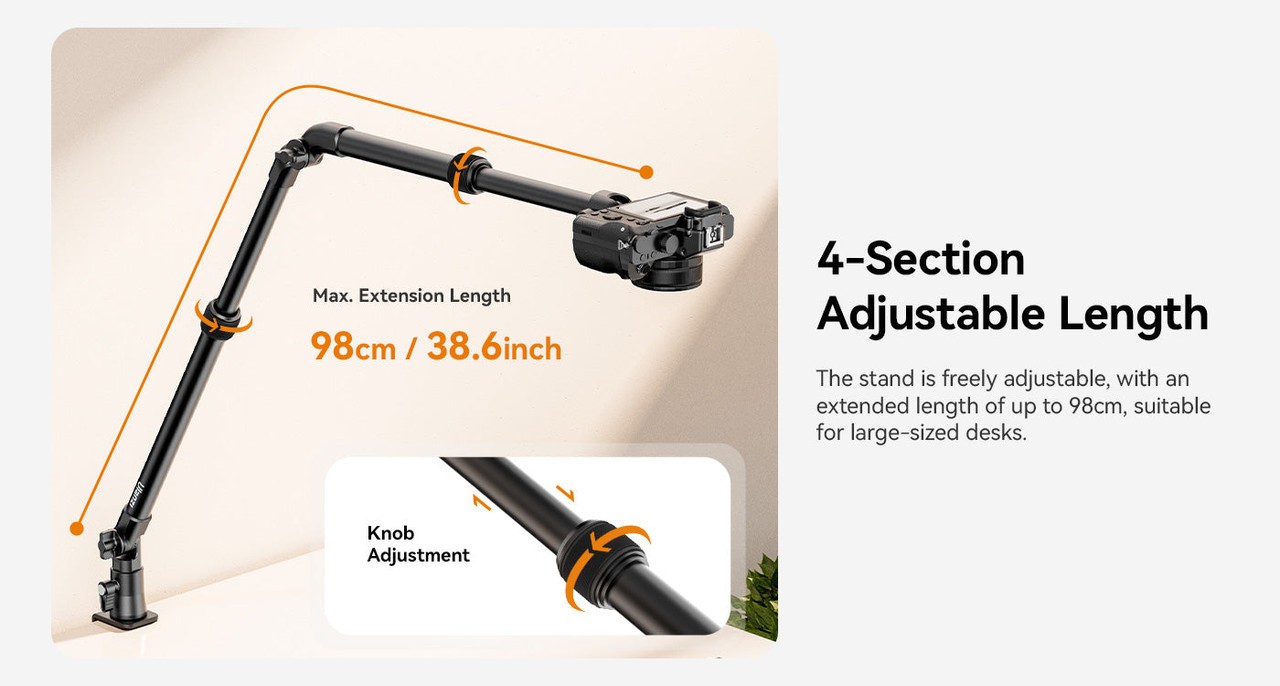 Ulanzi ZJ02 C-Clip sklopivi nosač je svestrani aluminijski stolni držač s fleksibilnom rukom, savršen za fotografiranje u ravnini, streaming ili snimanje iz gornjeg kuta. Podesiv do 65 cm u visini i 123 cm u duljini, pouzdano drži uređaje do 2 kg čvrstom C-stezaljkom.