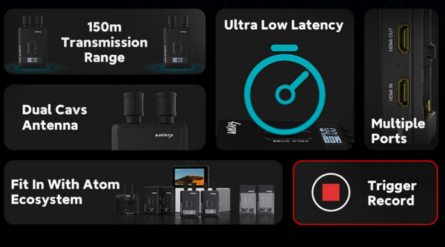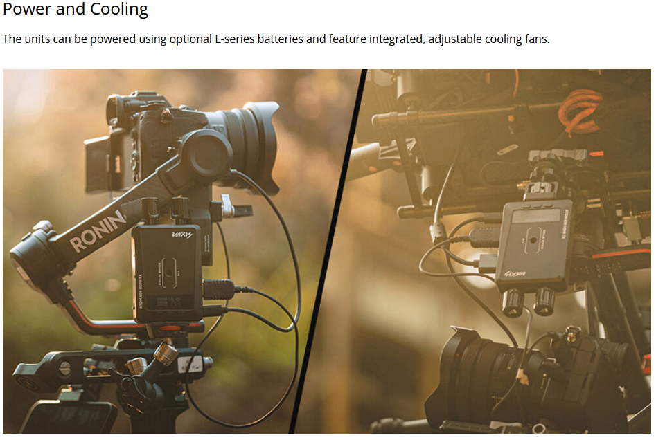 Vaxis Atom 600 HDMI bežični video odašiljač/prijemnik pruža vizualno bez gubitaka 1080p60 video s latencijom manjom od 80 ms na udaljenosti od 600 stopa, podržavajući istovremeni prijenos na do pet uređaja (dva prijemnika i tri mobilne aplikacije), s dvopojasnim 2,4/5,8 GHz antenama, podesivim ventilatorima za hlađenje, OLED zaslonima, kompatibilnošću s L-serijom baterija i USB-C priključkom za ažuriranja firmvera te 5V/2A izlazom.