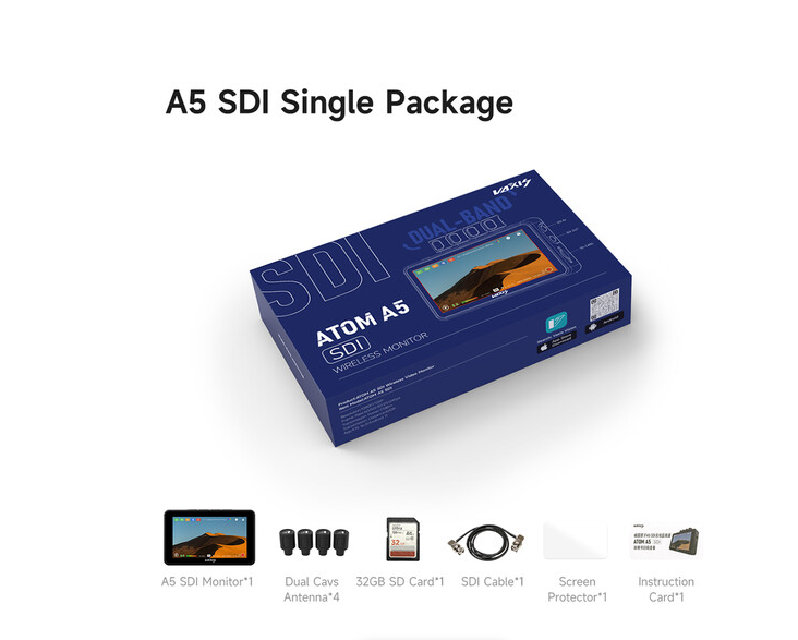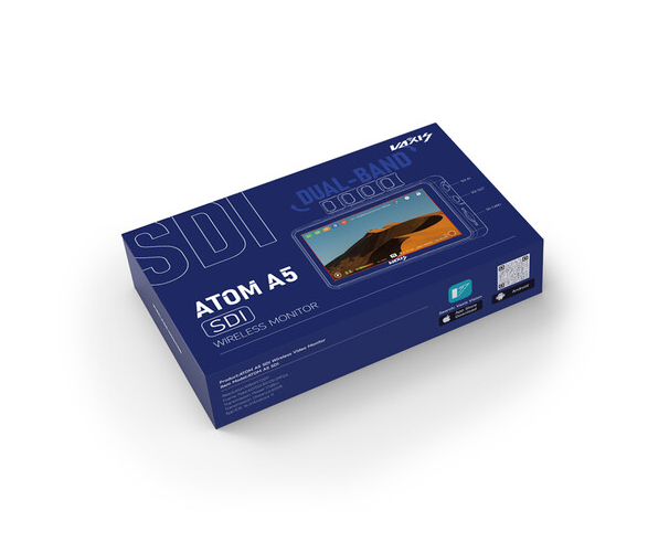 Vaxis Atom A5 SDI je kompaktni 5,5-inčni bežični monitor osjetljiv na dodir rezolucije 1920x1080 s integriranom TX/RX funkcionalnošću, koji podržava domet prijenosa do 300 metara unutar Atom ekosustava, s SDI/HDMI ulazima i loop izlazima, ugrađenim MP4 snimanjem na microSD karticu, dvostrukom baterijskom pločom L-serije, svjetlinom od 2000 cd/m², zamjenjivim antenama, sinkronizacijom vremenskog koda, podrškom za 3D LUT i naprednim CINE OS alatima, uključujući teleskope i peaking za precizno praćenje na setu i bežično praćenje fokusa.