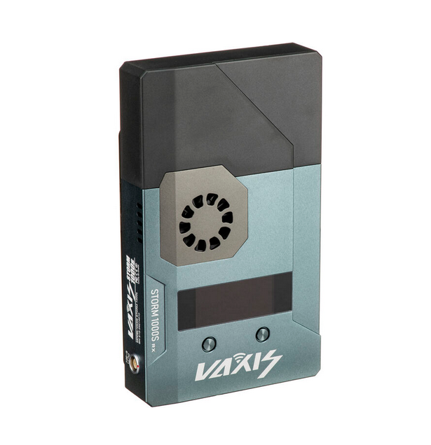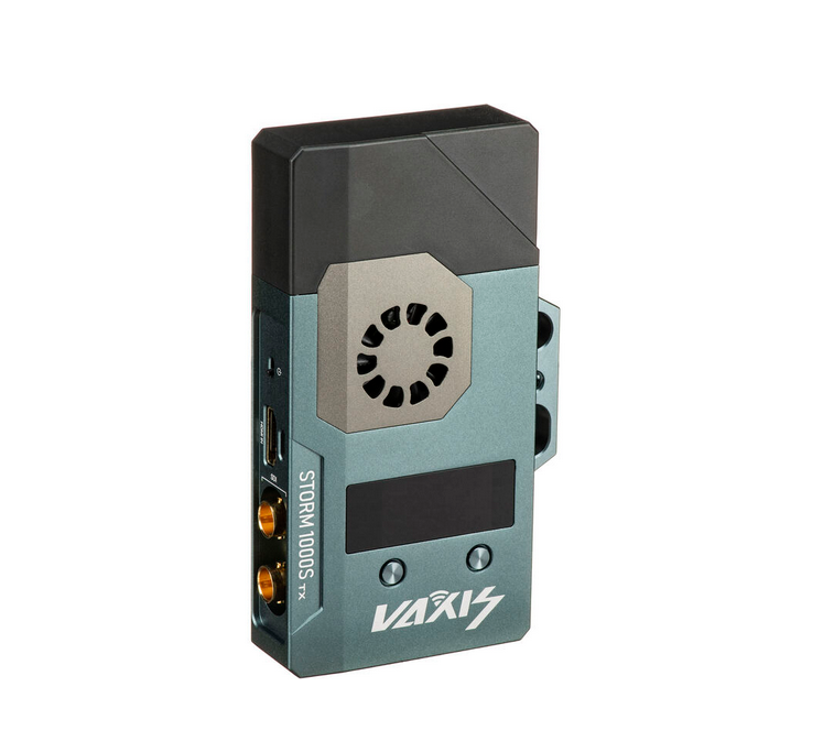 Vaxis Storm 1000S bežični komplet (zlatni nosač) pruža profesionalni, nekomprimirani 1080p60 video prijenos s latencijom manjom od 1 ms preko 1148' linije vidljivosti koristeći 20 odabranih 40/20 MHz kanala u pojasu od 5,1–5,9 GHz. Odašiljač nudi 1x 3G-SDI ulaz, 1x SDI petlju i 1x HDMI ulaz s HDMI/SDI cross-konverzijom, dok prijemnik nudi 2x 3G-SDI i 1x HDMI izlaze. Obje jedinice imaju svijetle LCD zaslone, bočno ventilirane ventilatore za hlađenje, unutarnje antene i montažu od 1/4"-20. Prijemnik uključuje fiksnu zlatnu ploču za montažu; obje podržavaju 2-pinski LEMO ili micro-USB napajanje (7–36 VDC). Multicast omogućuje jedan TX na više RX-ova, a 0' način rada podržava trenutnu reprodukciju na ALEXA Mini. Potpuno kompatibilan sa sustavima Vaxis Storm 058, 800, 2000 i 5000, komplet dolazi u zaštitnoj kutiji za let.