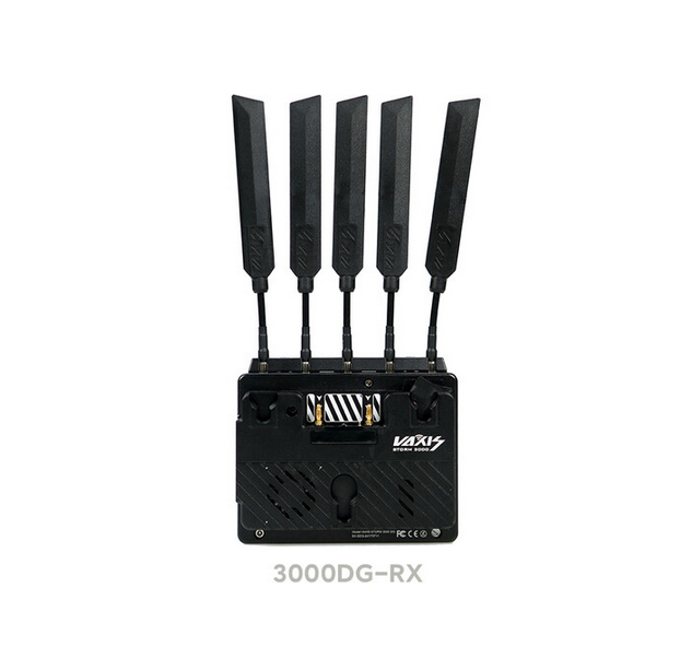 Bežični prijemnik Vaxis Storm 3000DG (zlatni nosač) isporučuje nekomprimirani video bez latencije u rezoluciji 1080p60 s udaljenosti do 914 m s dvostrukim 3G-SDI i HDMI 1.3 izlazima, AES-128 enkripcijom, 20-kanalnim radom na 5 GHz i integriranom pločom za montažu Gold za profesionalne postavke više prijemnika.