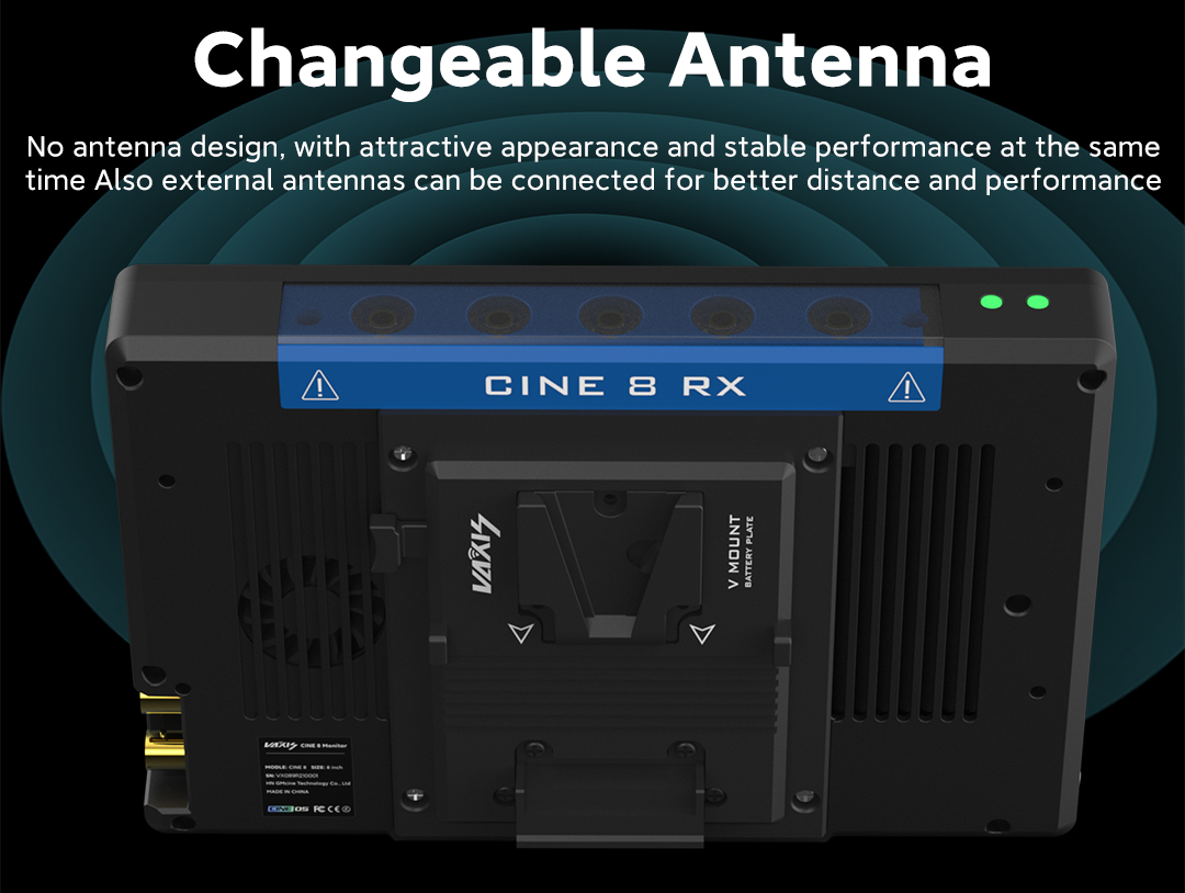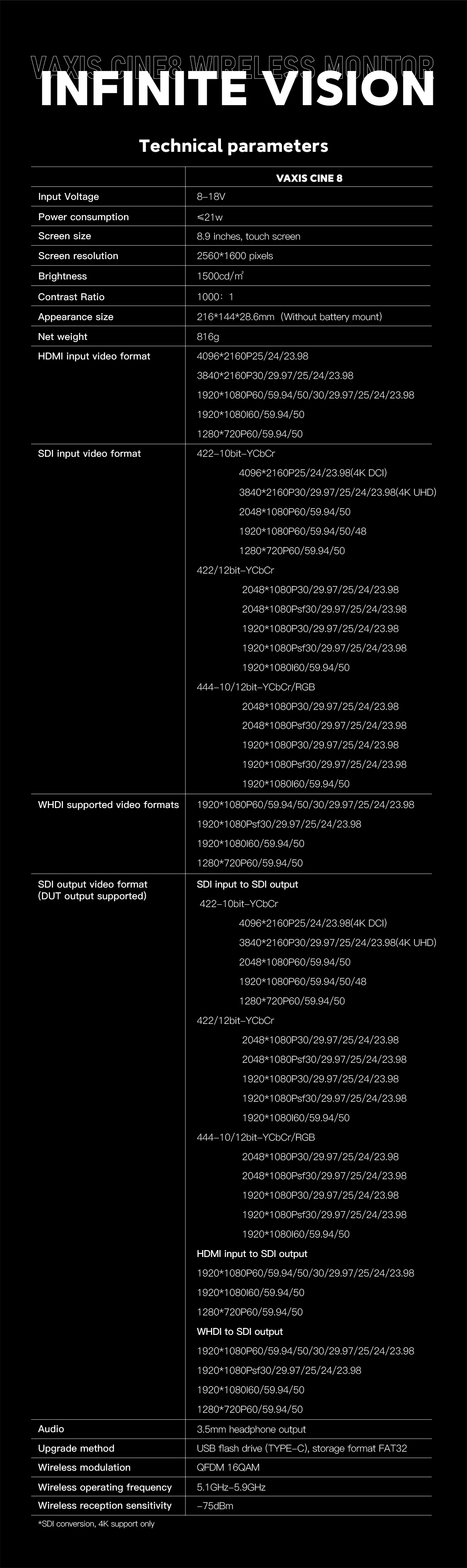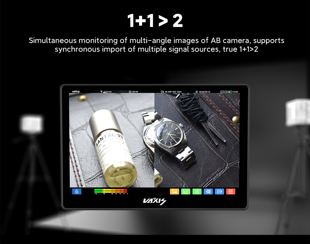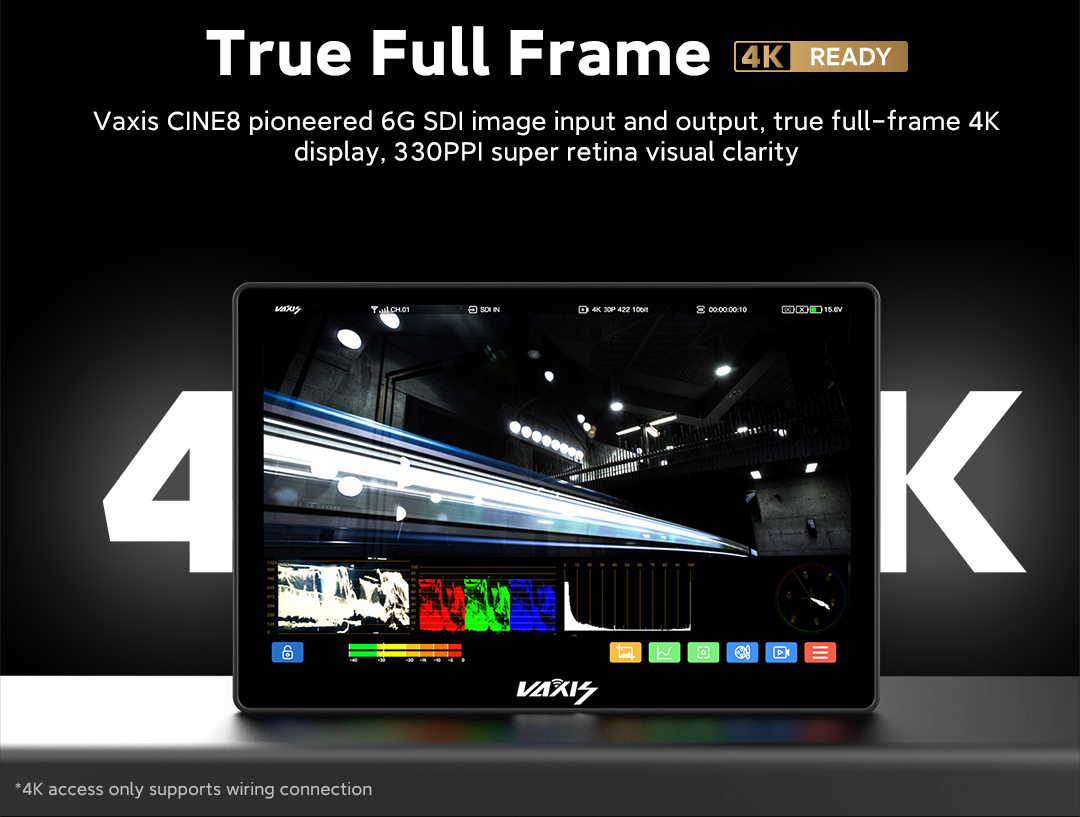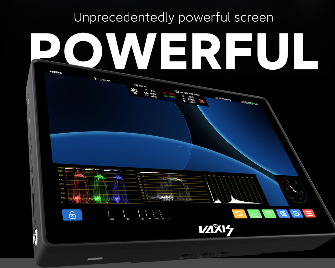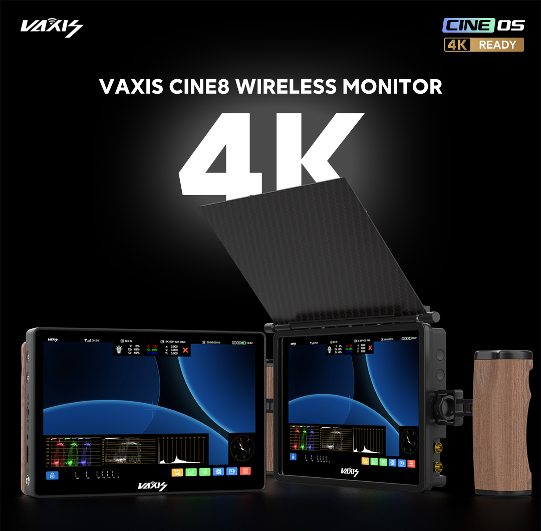 Imaju sve funkcije tradicionalnog bežičnog video sustava i optimiziran način interakcije. Omogućuje različite metode odabira antene i integrira funkciju frekvencijskog raspona. Alat za detaljan nadzor. Grafikoni valnog oblika, vektorski dijagrami, histogrami, omotnice i uključuje sve. True Full Frame 4K READY. Vaxis CINE8 je pionir u 6G SDI ulazu i izlazu slike, pravom punom kadru 4K zaslona, 303PPI super retina vizualne jasnoće. 1+1 > 2. Simultani prikaz slike iz više kutova AB kamere