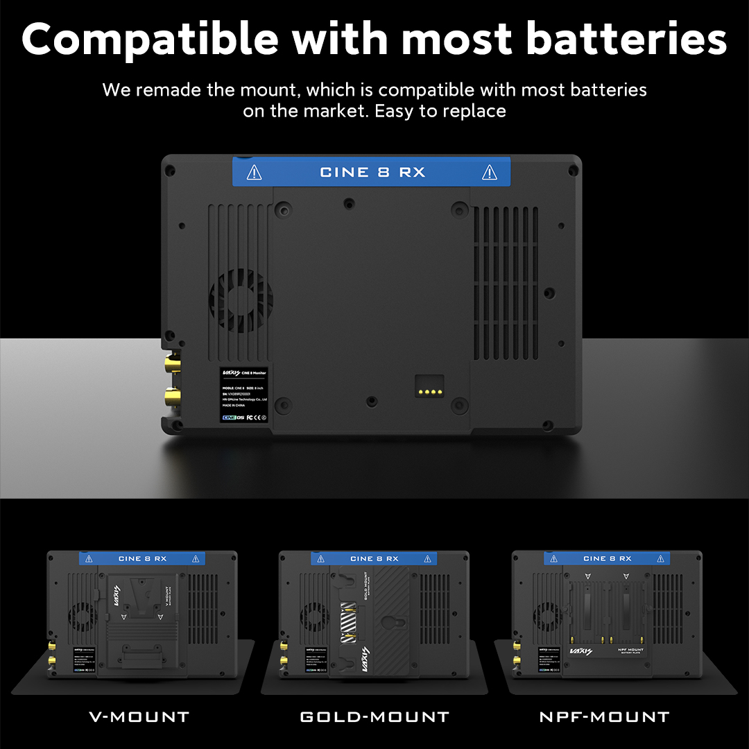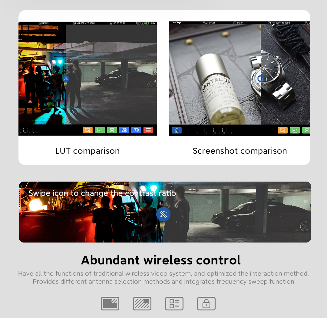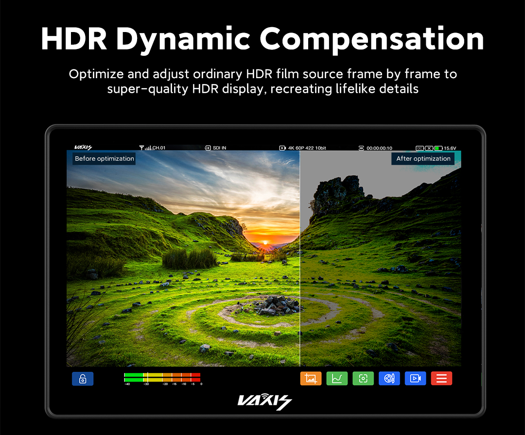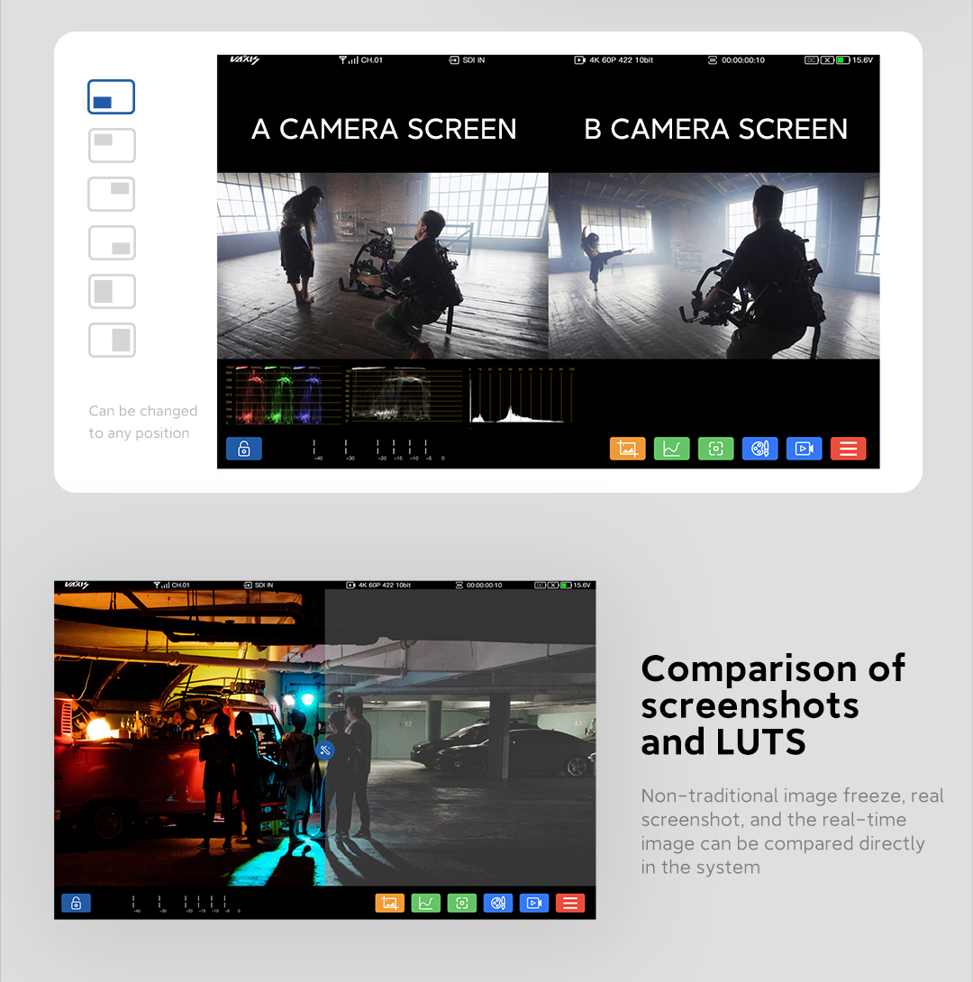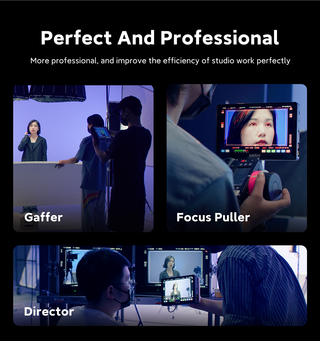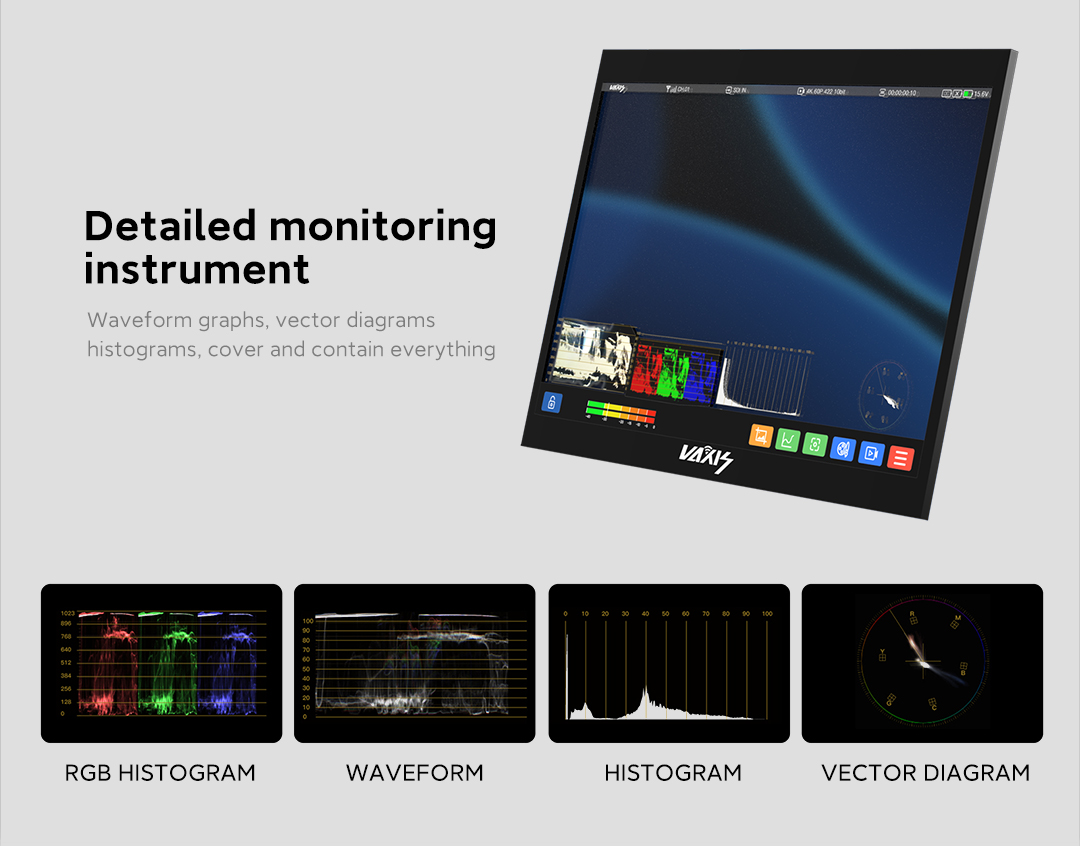 Imaju sve funkcije tradicionalnog bežičnog video sustava i optimiziran način interakcije. Omogućuje različite metode odabira antene i integrira funkciju frekvencijskog raspona. Alat za detaljan nadzor. Grafikoni valnog oblika, vektorski dijagrami, histogrami, omotnice i uključuje sve. True Full Frame 4K READY. Vaxis CINE8 je pionir u 6G SDI ulazu i izlazu slike, pravom punom kadru 4K zaslona, 303PPI super retina vizualne jasnoće. 1+1 > 2. Simultani prikaz slike iz više kutova AB kamere