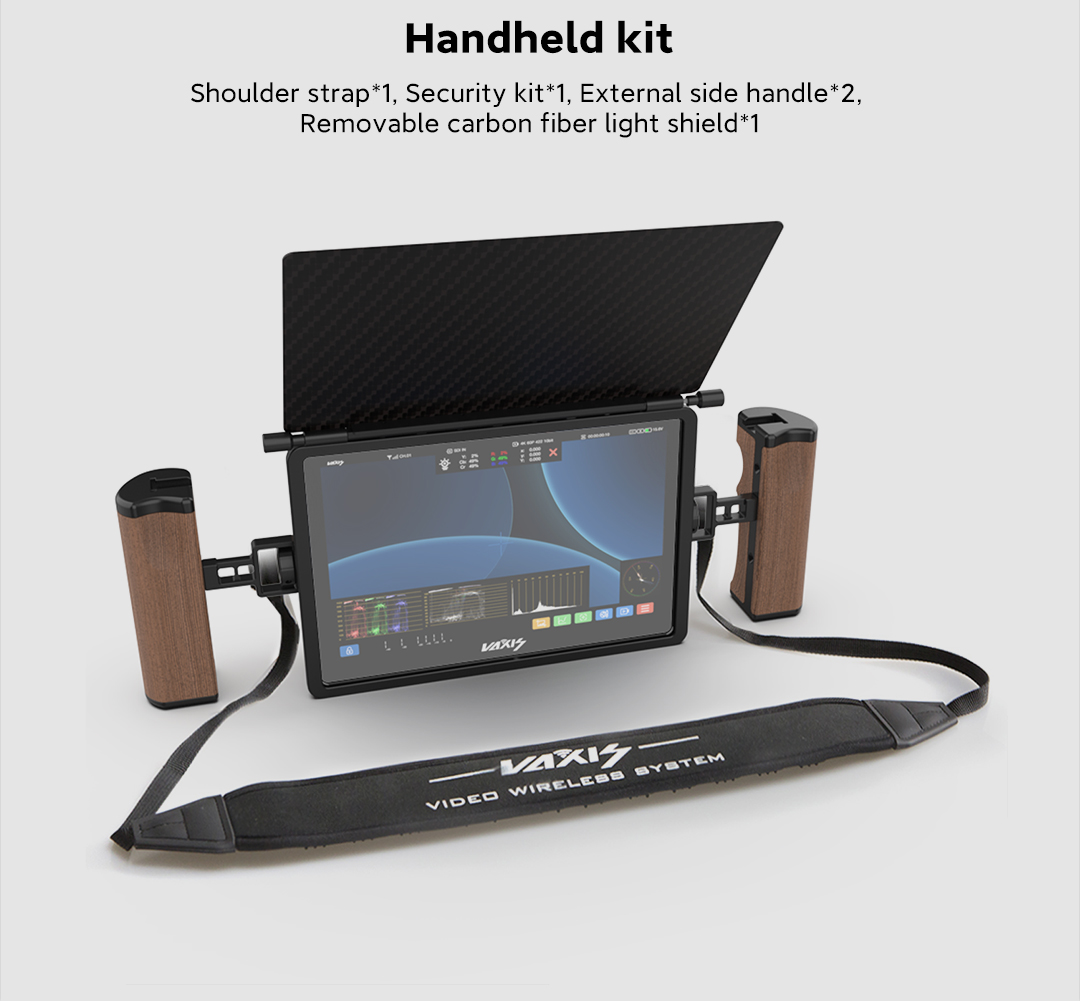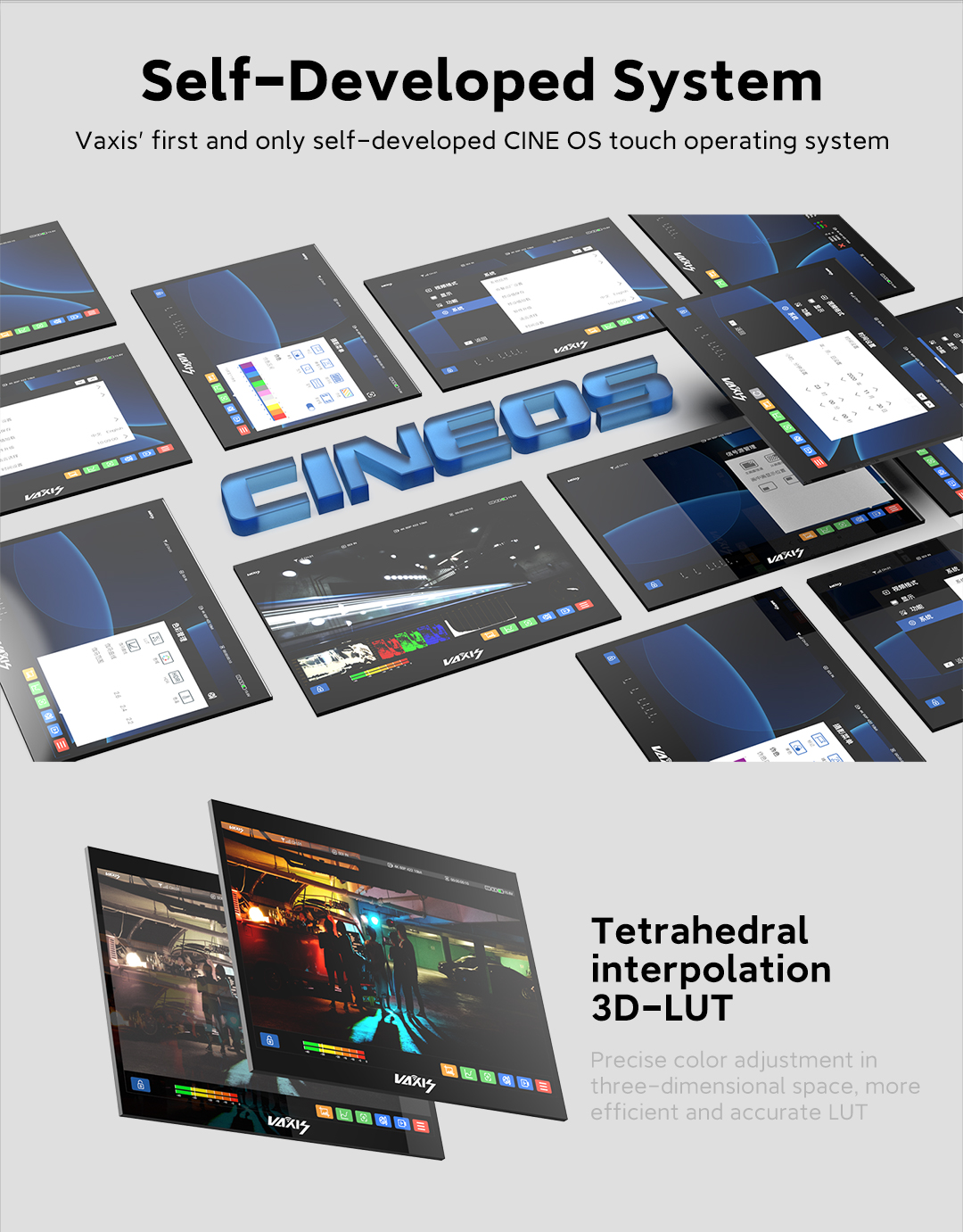 Vaxis Storm Cine 8 Monitor - 8,9 inča, 4K 2560 x 1600 piksela rezolucije, 1500 nita vršne svjetline - s ugrađenim Storm 3000 RX. Vlasnički sustav Prvi i jedini Vaxis CINE OS vlastiti operativni sustav za zaslone osjetljive na dodir. Tetraedarska interpolacija 3D-LUT .Precizno podešavanje boja u trodimenzionalnom prostoru, učinkovitiji i točniji LUT. Način rada slika u slici. Višekanalni pristup ekranu, mijenjanje položaja prikaza slike u slici na bilo koje mjesto. Usporedba ekrana i LUTS-a. Nekonvencionalno zamrzavanje slike, trenutna snimka zaslona i slika u stvarnom vremenu mogu se usporediti izravno u sustavu. Bogata bežična kontrola
