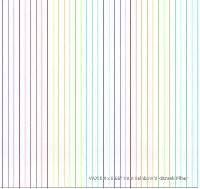 VFX 4 x 5,65" Rainbow Streak Filter tvrtke Vaxis postavlja se u kompatibilne mat kutije i stvara izdužene pruge duginih boja koje su simetrične i protežu se vodoravno od točkastih izvora svjetlosti unutar scene. Može privući pozornost na određeni dio kadra ili stvoriti vizualno dramatičan učinak. Filtar je izrađen od vodeno bijelog stakla za optičku jasnoću i vjernost boja. A uključena je podstavljena torbica za skladištenje i transport.