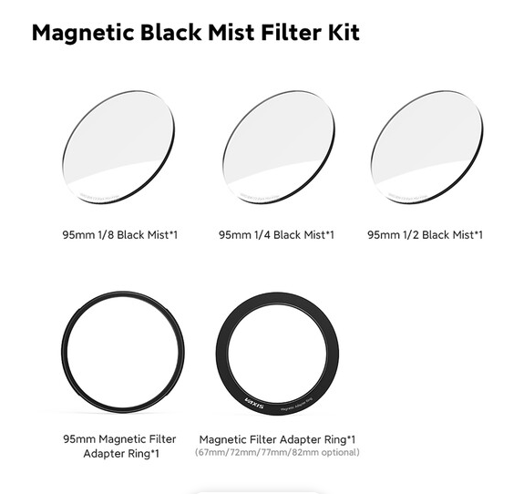 VAXIS VFX 95mm magnetski komplet filtera za crnu maglu nudi tri jačine filtera za crnu maglu (1/4, 1/8, 1/2) za prilagodljivu difuziju mekog svjetla sa smanjenim istaknutim dijelovima i kontrastom, uparene s 95mm magnetskim adapter prstenom za brzo i slagajuće pričvršćivanje na Tilta Mirage Matte Box - svaki ultra lagani filter od 1 oz uključuje Alcantara kožnu torbicu za zaštitu.