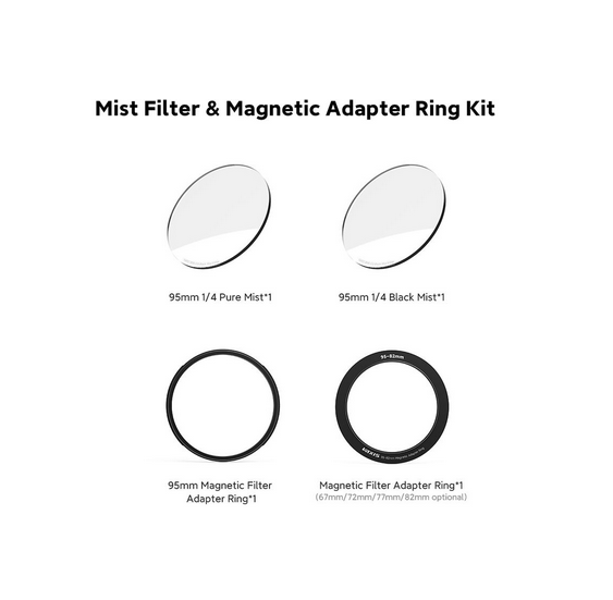 Vaxis 95mm VFX Magnetic Mist komplet filtera uključuje jedan 1/4 Black Mist i jedan 1/4 Pure Mist filter, oba dizajnirana za Tilta Mirage Matte Box, zajedno s 95mm magnetskim adapterom koji omogućuje brzu zamjenu ili slaganje filtera na 95mm objektivima bez odvrtanja, pružajući meku kvalitetu svjetla sa smanjenim osvijetljenim dijelovima i nižim kontrastom za prilagodljive kinematografske efekte.