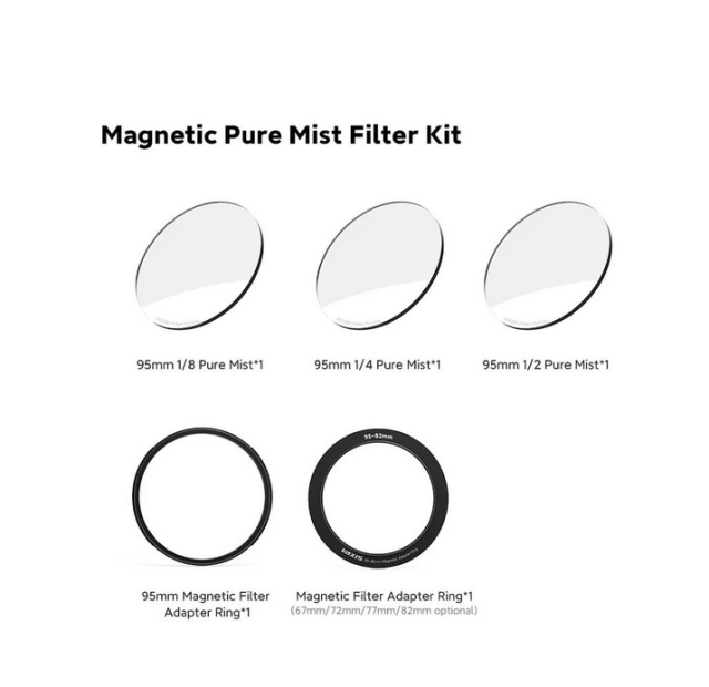 Vaxis 95mm VFX Magnetic Pure Mist komplet filtera uključuje tri Pure Mist filtera jačine 1/2, 1/4 i 1/8, dizajnirana za Tilta Mirage Matte Box, zajedno s 95mm magnetskim adapterom koji omogućuje brzu zamjenu i slaganje filtera na 95mm objektive bez odvrtanja, pružajući meku kvalitetu svjetla sa smanjenim osvijetljenim dijelovima i nižim kontrastom za prilagodljive kinematografske efekte.