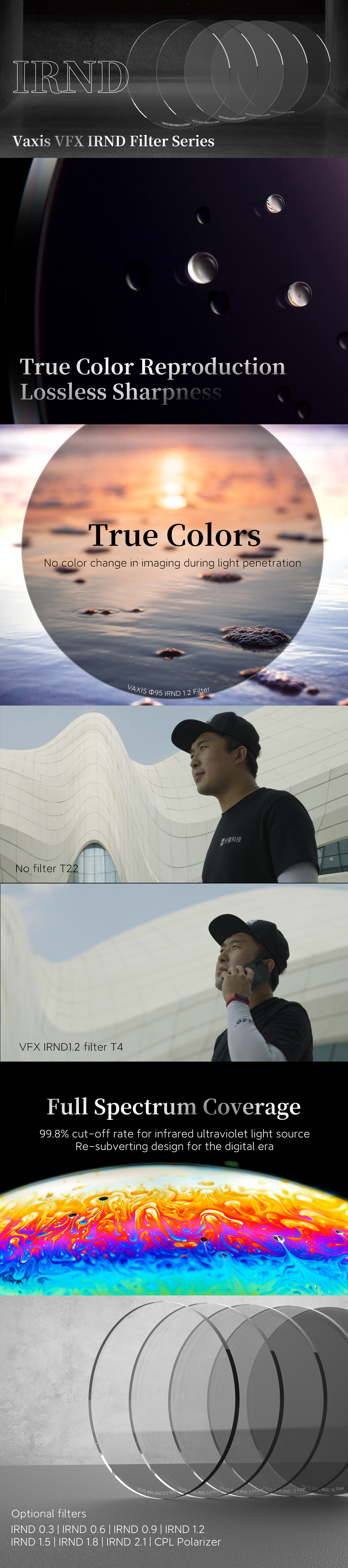 Vaxis VFX IRND filter 95mm 1.8. Prava reprodukcija boja, oštrina bez gubitaka. Istinite boje. Nema promjene boje na slici tijekom prodiranja svjetla. Potpuna pokrivenost spektra. 99,8% stope prekida za izvor infracrvenog ultraljubičastog svjetla. Ponovna subverzija dizajna za digitalnu eru.